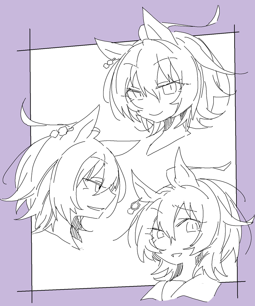1girl :d agnes_tachyon_(umamusume) ahoge animal_ears beer_hsk closed_mouth commentary_request hair_between_eyes horse_ears multiple_views open_mouth purple_background school_uniform smile tracen_school_uniform two-tone_background umamusume white_background