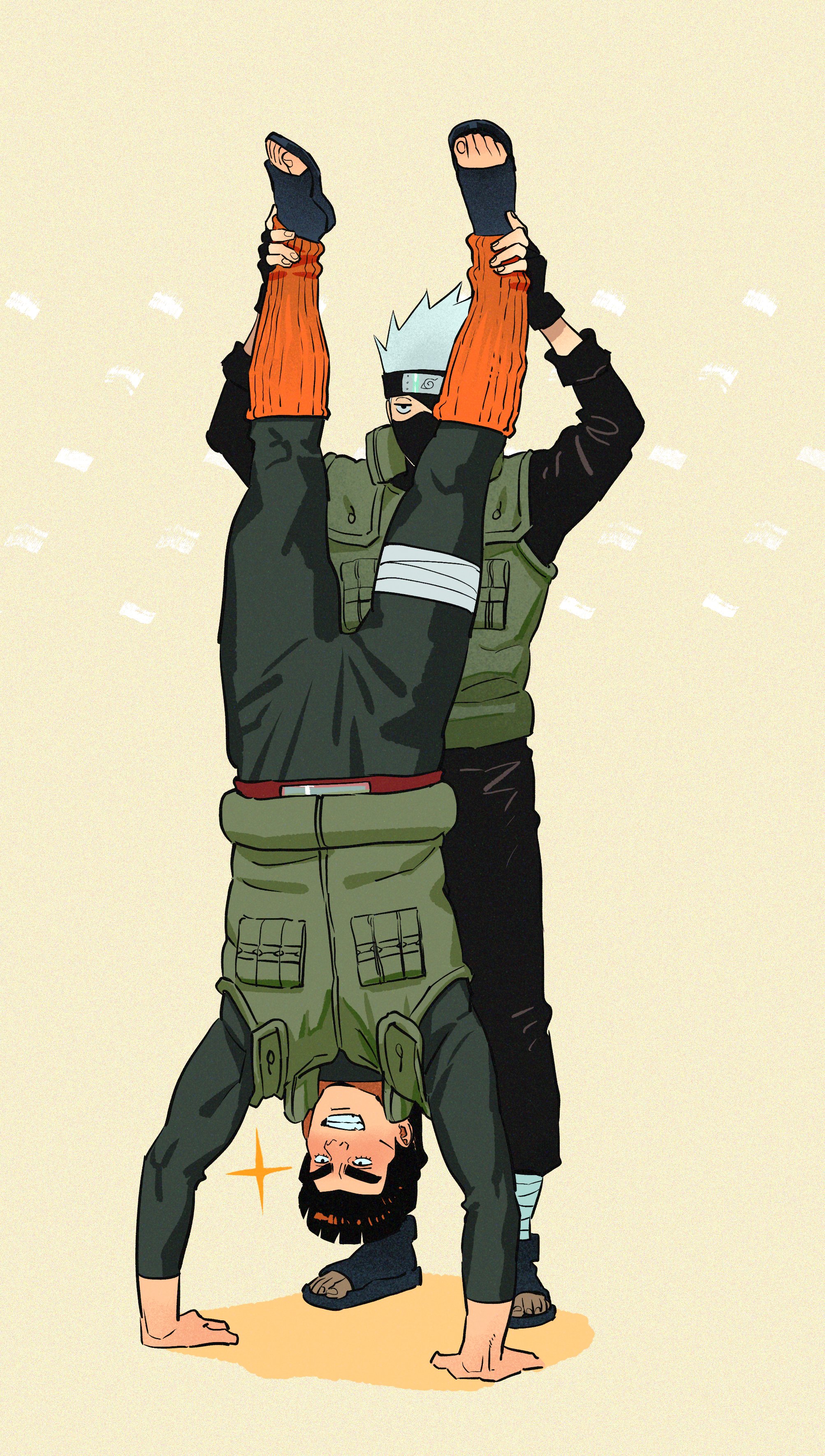 2boys absurdres belt black_gloves black_hair black_headband black_mask black_pants black_shirt black_shoes blunt_bangs bodysuit cheekbones fingerless_gloves flak_jacket full_body gloves green_bodysuit green_vest grey_hair grin handstand hatake_kakashi headband highres holding_another's_ankles intelli_intel jacket konohagakure_shinobi_uniform konohagakure_symbol leg_warmers male_focus mask might_guy mouth_mask multiple_boys naruto_(series) open-toe_shoes orange_leg_warmers pants red_belt ribbed_leg_warmers shirt shoes short_hair smile sparkle spiked_hair teeth thick_eyebrows upside-down vest yellow_background