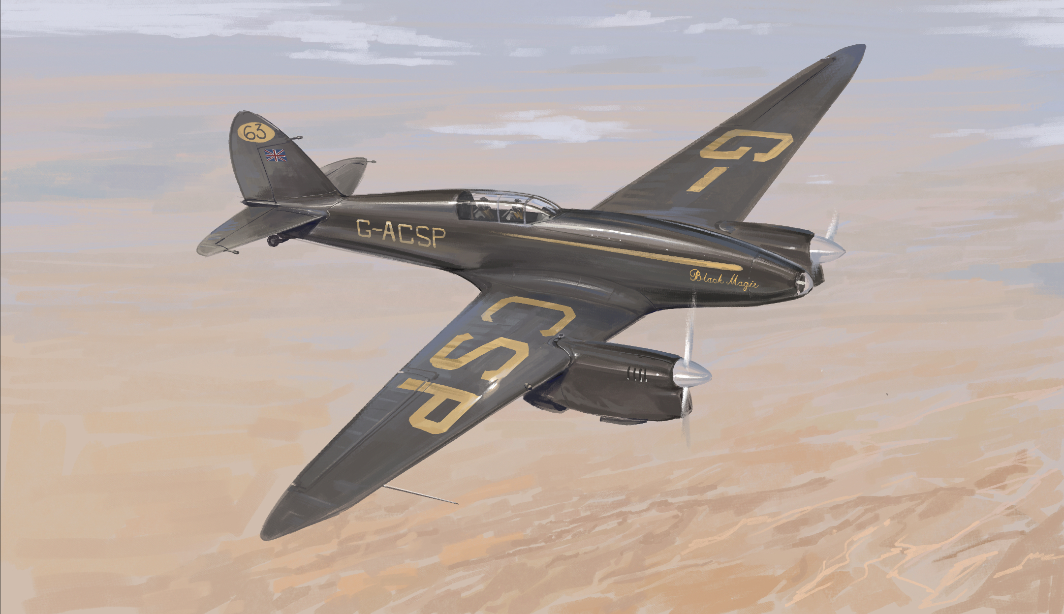 2others aircraft airplane cloud commentary cotact147 desert dh_88_comet flying grey_sky high_up highres multiple_others original propeller sky union_jack untranslatable_commentary vehicle_focus