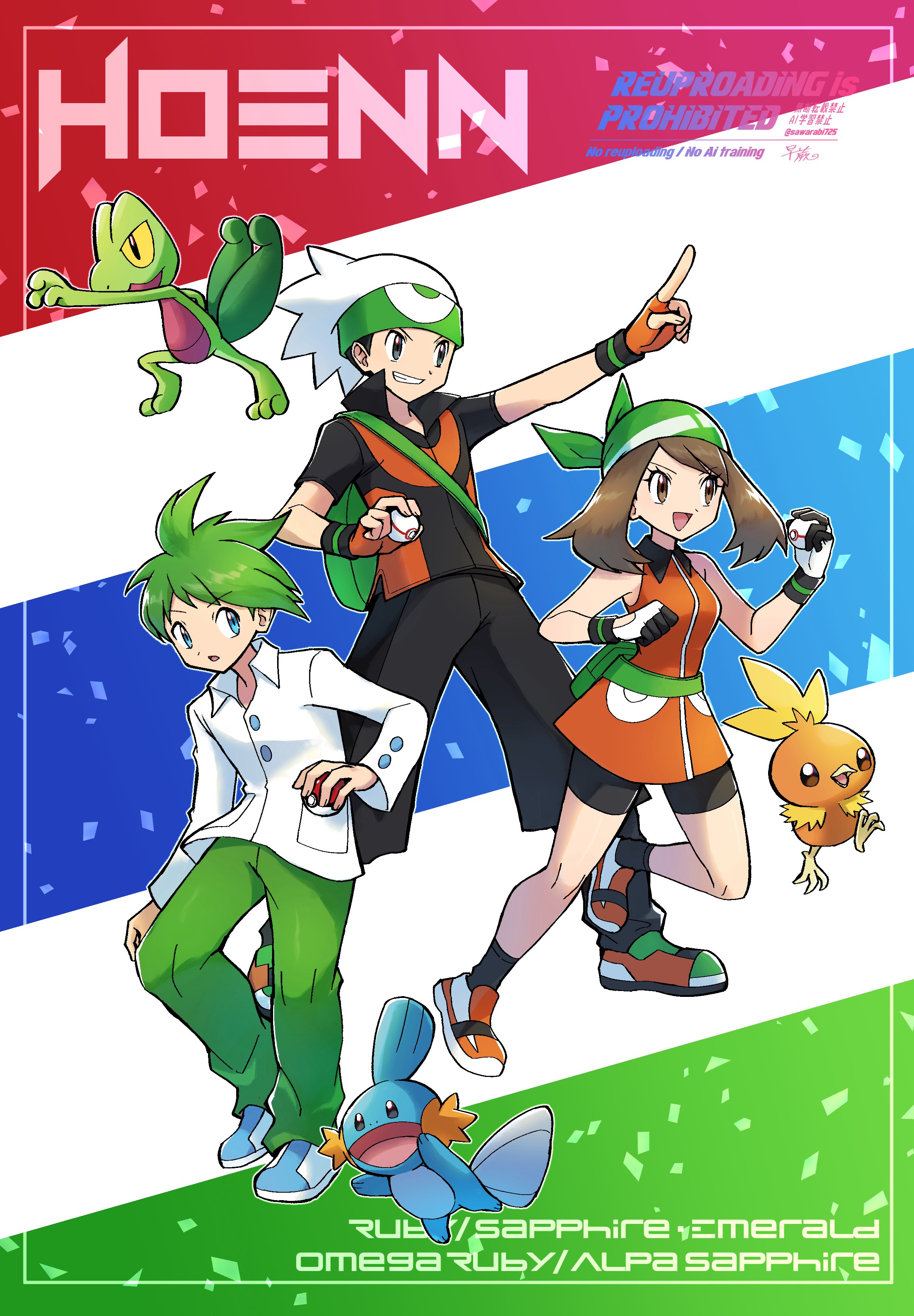 1girl 2boys absurdres backpack bag bandana belt bike_shorts bike_shorts_under_skirt black_shirt black_shorts black_socks brendan_(pokemon) brown_hair commentary_request dress fingerless_gloves full_body gen_3_pokemon gloves green_bandana green_hair green_pants grin hat highres holding holding_poke_ball index_finger_raised may_(pokemon) mixed-language_commentary mudkip multiple_boys nintendo open_mouth pants parted_lips poke_ball pokemon pokemon_(creature) pokemon_emerald pokemon_ruby/sapphire/emerald premier_ball red_dress red_gloves sawarabi_(sawarabi725) shirt short_hair shorts smile socks starter_pokemon_trio torchic treecko wally_(pokemon) white_shirt