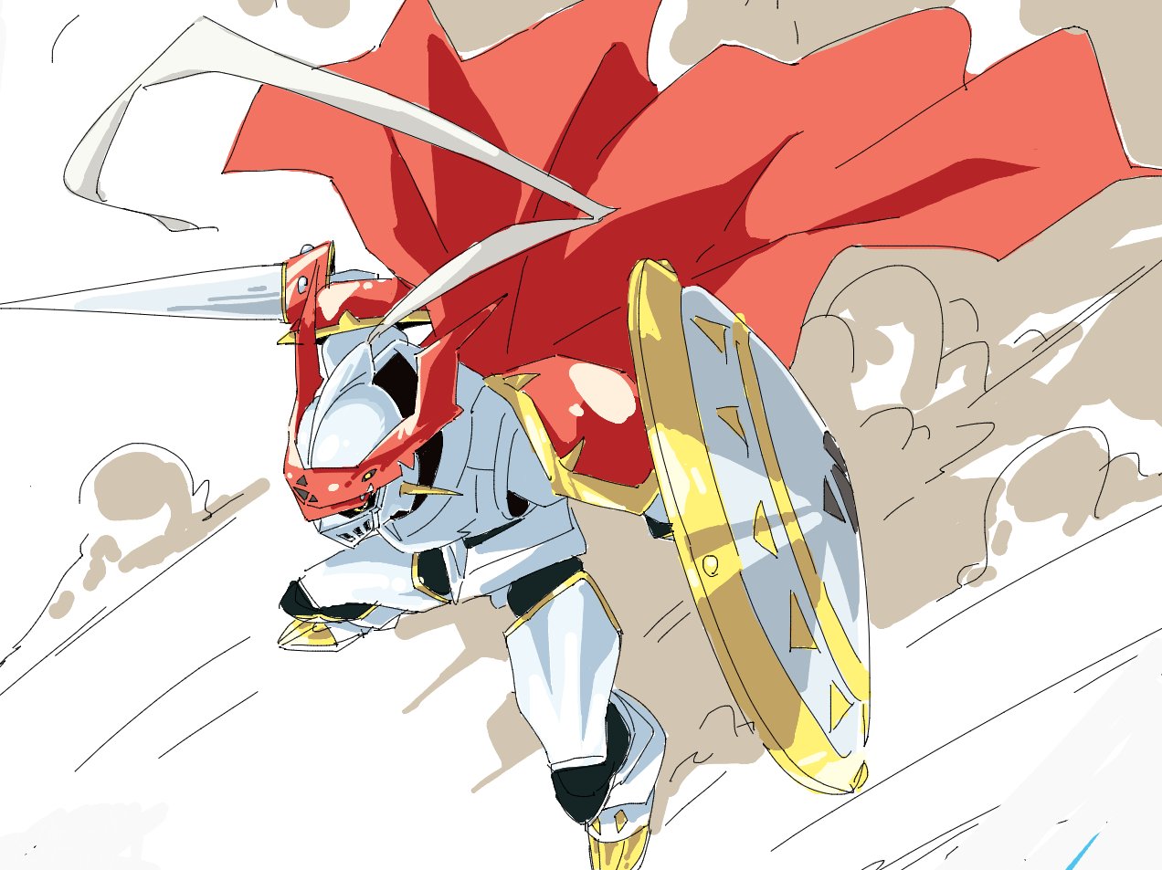 armor asymmetrical_dual_wielding baasaku_(balasaku24) cape commentary_request digimon digimon_(creature) dual_wielding dukemon from_above from_behind full_body helmet holding holding_polearm holding_shield holding_weapon lance polearm red_cape shield weapon white_armor white_helmet