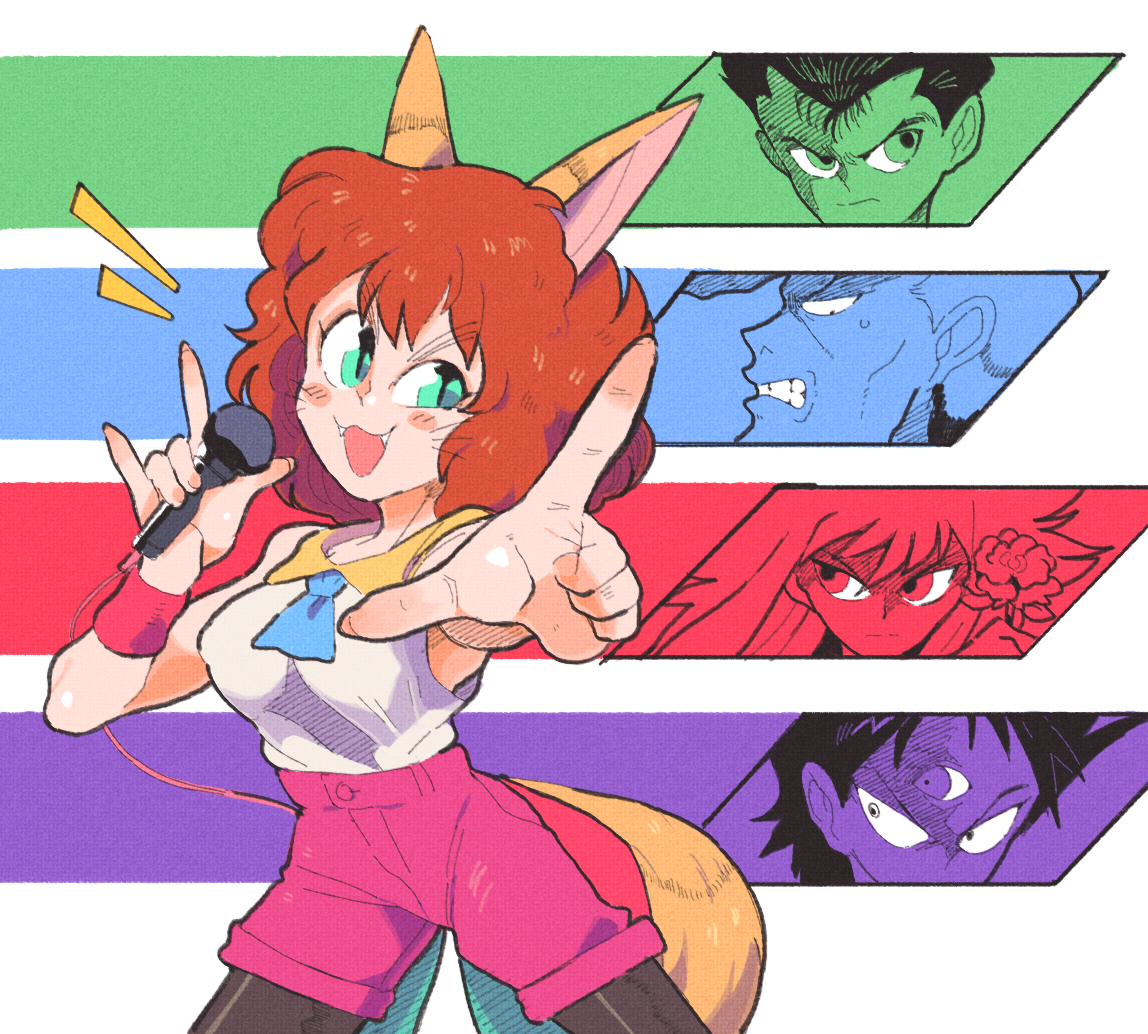 1girl 4boys animal_ears breasts brown_hair clenched_teeth commentary cowboy_shot english_commentary flower fox_ears fox_girl fox_tail green_eyes hands_up hiei_(yu_yu_hakusho) holding holding_flower inkerton-kun koto_(yu_yu_hakusho) kurama_(yu_yu_hakusho) kuwabara_kazuma looking_at_viewer multiple_boys notice_lines pink_shorts pointing pointing_at_viewer pompadour rose shirt short_hair shorts sleeveless sleeveless_shirt solo tail teeth third_eye urameshi_yuusuke v-shaped_eyebrows whiskers white_shirt yuu_yuu_hakusho