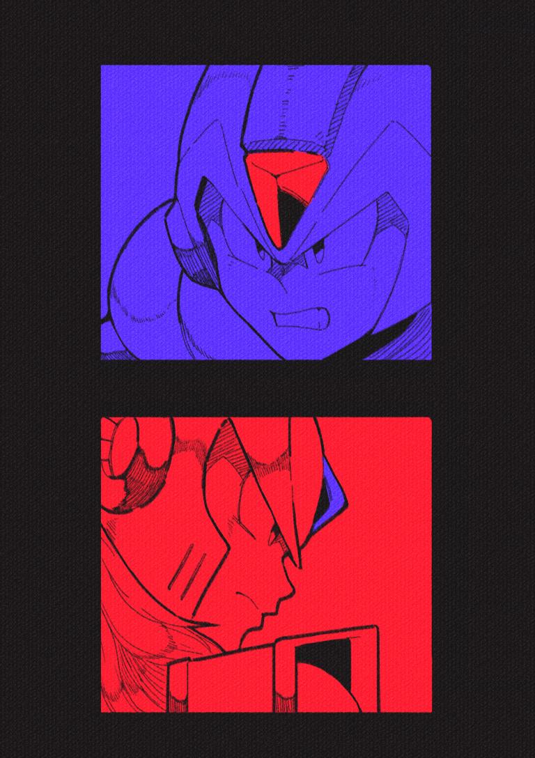 2boys android blue_gem blue_theme clenched_teeth commentary forehead_jewel from_side frown gem helmet inkerton-kun limited_palette looking_at_viewer male_focus mega_man_(series) mega_man_x_(series) monochrome multiple_boys multiple_monochrome portrait profile red_gem red_theme spot_color teeth untranslatable_commentary x_(mega_man) zero_(mega_man)