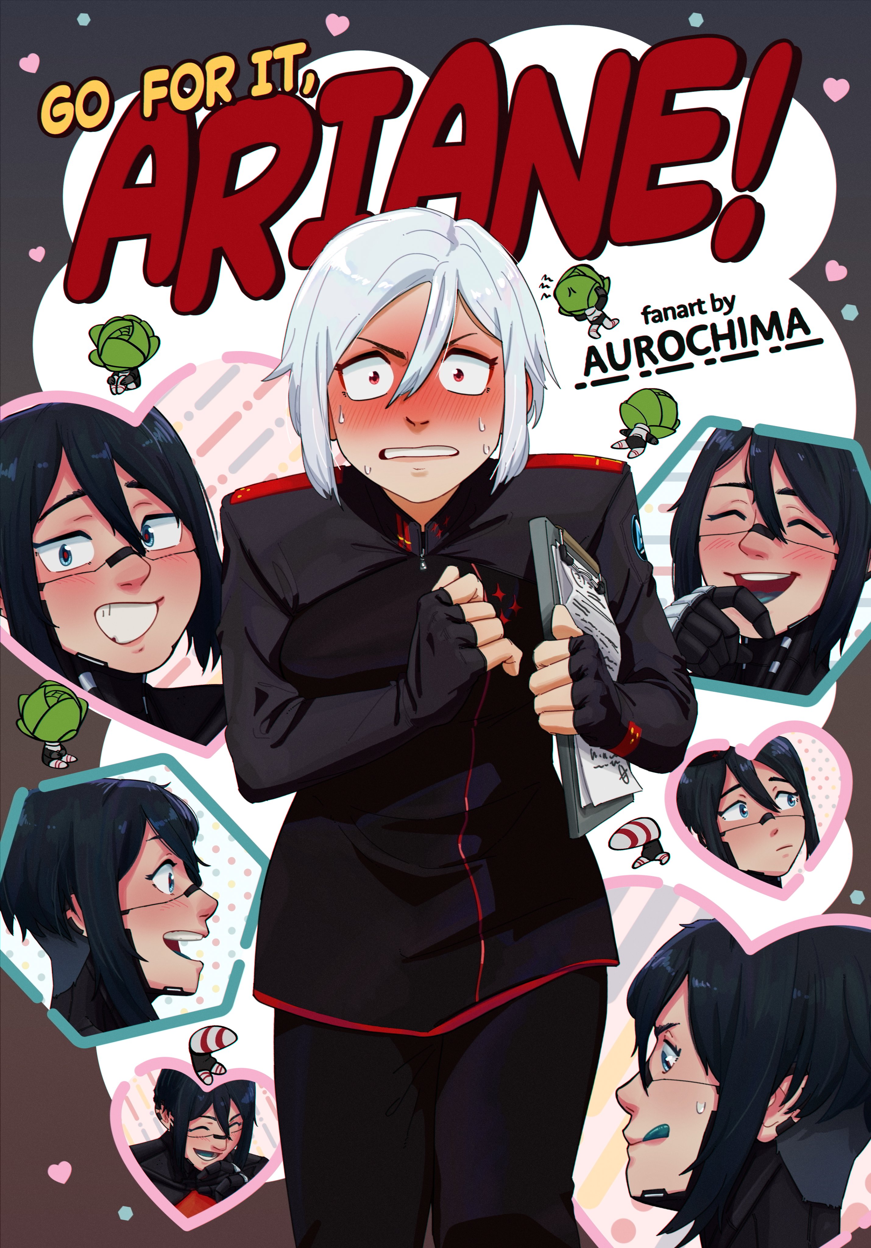 2girls ^_^ absurdres android ariane_yeong artist_name aurochima black_hair black_pants blue_eyes blush character_name clenched_teeth clipboard closed_eyes commentary constricted_pupils elster_(signalis) english_commentary ganbare!_nakamura-kun!! ganbare!_nakamura-kun!!_cover_parody grin heart highres holding holding_clipboard multiple_girls multiple_views pants parody red_eyes short_hair shrug_(clothing) signalis skin_seams smile standing sweat teeth white_hair yuri