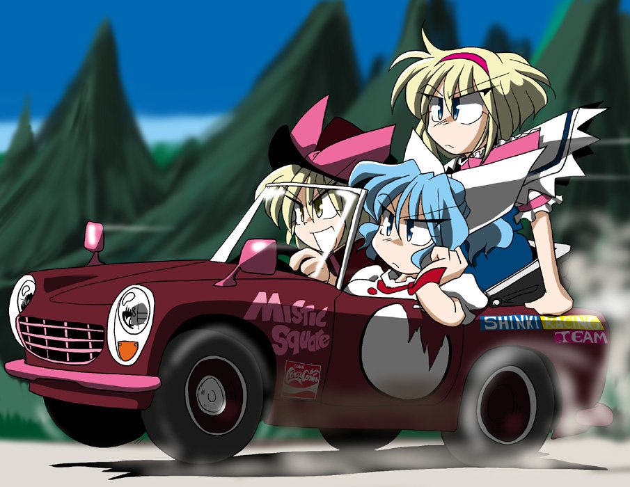 3girls alice_margatroid blonde_hair blue_dress blue_hair blue_sky blurry blurry_background bow capelet car coca-cola commentary_request convertible dress driving dust_cloud frown hair_bow hand_on_own_chin kieyza mai_(touhou) motor_vehicle multiple_girls mystic_square neckerchief open_mouth pine_tree pink_bow pink_neckerchief red_car shirt short_hair sky smile touhou touhou_(pc-98) tree white_bow white_capelet white_shirt yellow_eyes yuki_(touhou)