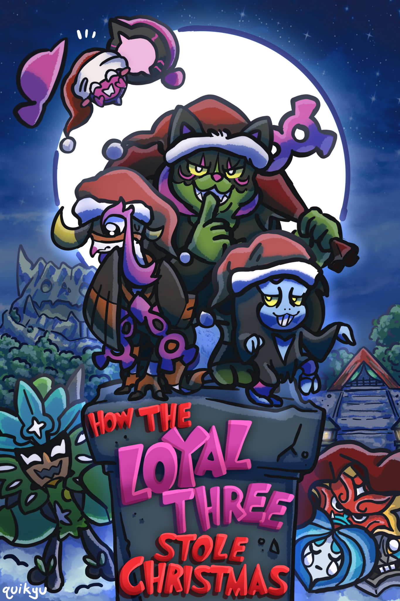 1girl 1other 3boys artist_name bag christmas closed_mouth clothed_pokemon commentary english_commentary english_text fezandipiti floating full_moon gen_9_pokemon grin hat highres holding holding_bag holding_sack how_the_grinch_stole_christmas! legendary_pokemon mask moon multiple_boys munkidori night nintendo nostrils ogerpon ogerpon_(cornerstone_mask) ogerpon_(hearthflame_mask) ogerpon_(teal_mask) ogerpon_(wellspring_mask) okidogi parody pecharunt pokemon pokemon_(creature) pokemon_focus quikyu red_bag red_hat sack santa_hat sharp_teeth sky smile standing standing_on_one_leg star_(sky) sweatdrop teeth unworn_mask