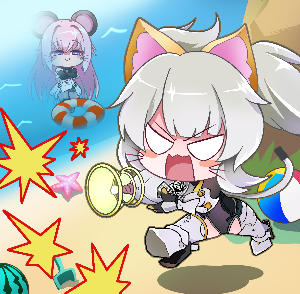 2girls animal_ears ball beachball black_leotard blank_eyes cat_ears cat_girl commentary_request dorinhakawaii energy_gun grey_hair highres holding holding_energy_gun holding_weapon karenina:_scire_(pgr) karenina_(pgr) kemonomimi_mode leotard looking_at_another mouse_ears mouse_girl multiple_girls open_mouth pink_hair punishing:_gray_raven purple_eyes smug teddy:_decryptor_(pgr) teddy_(pgr) twintails v-shaped_eyebrows weapon