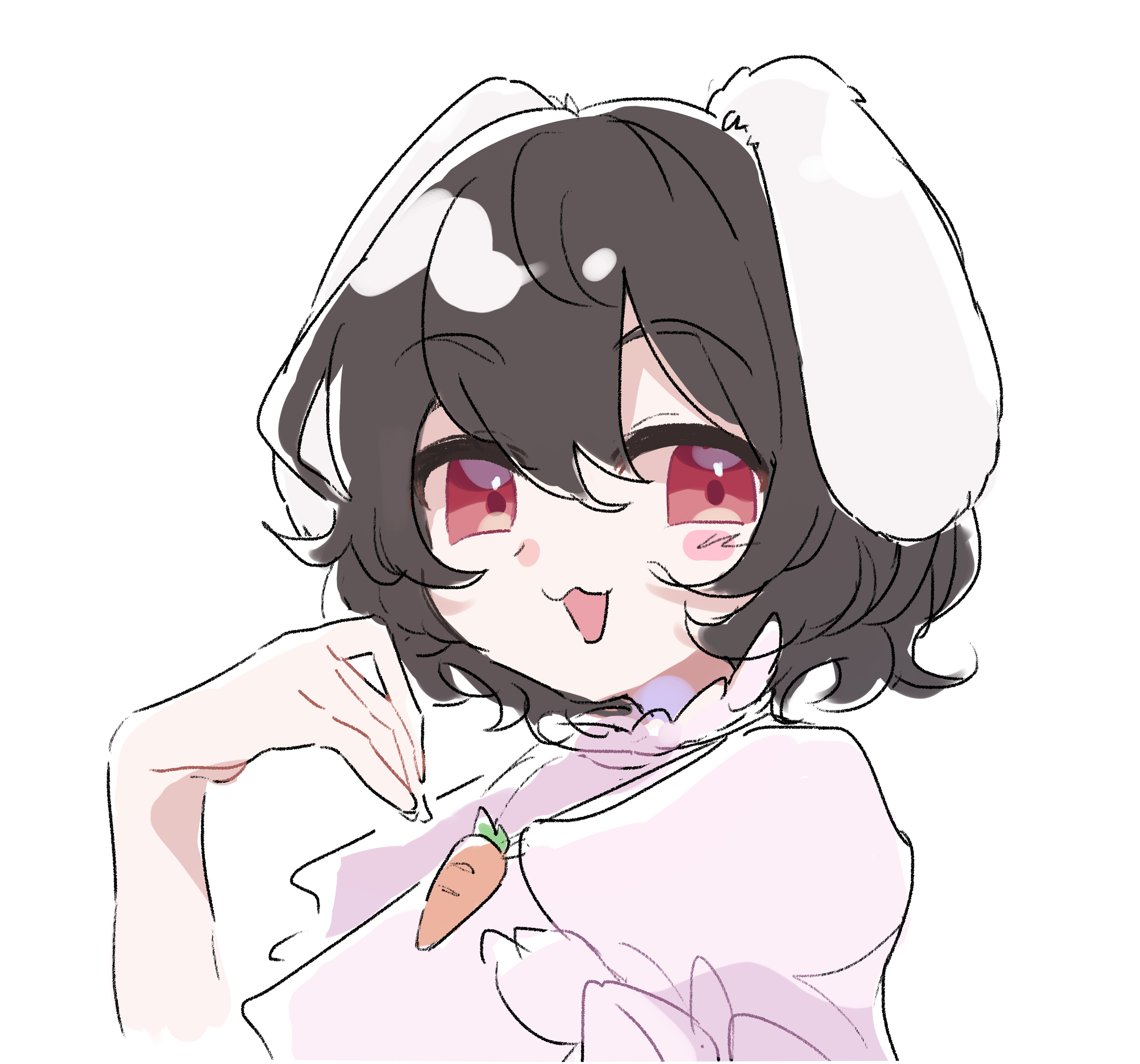 1girl :3 :d absurdres animal_ears black_hair blush blush_stickers bob_cut carrot_necklace close-up commentary dress floppy_ears from_side hair_between_eyes hand_up highres inaba_tewi jewelry looking_at_viewer looking_to_the_side narrowed_eyes necklace open_mouth pendant pink_dress portrait puffy_short_sleeves puffy_sleeves rabbit_ears rabbit_girl raised_eyebrows red_eyes short_hair short_sleeves simple_background sketch smile smug solo teasing toori_sototo touhou turning_head wavy_hair white_background