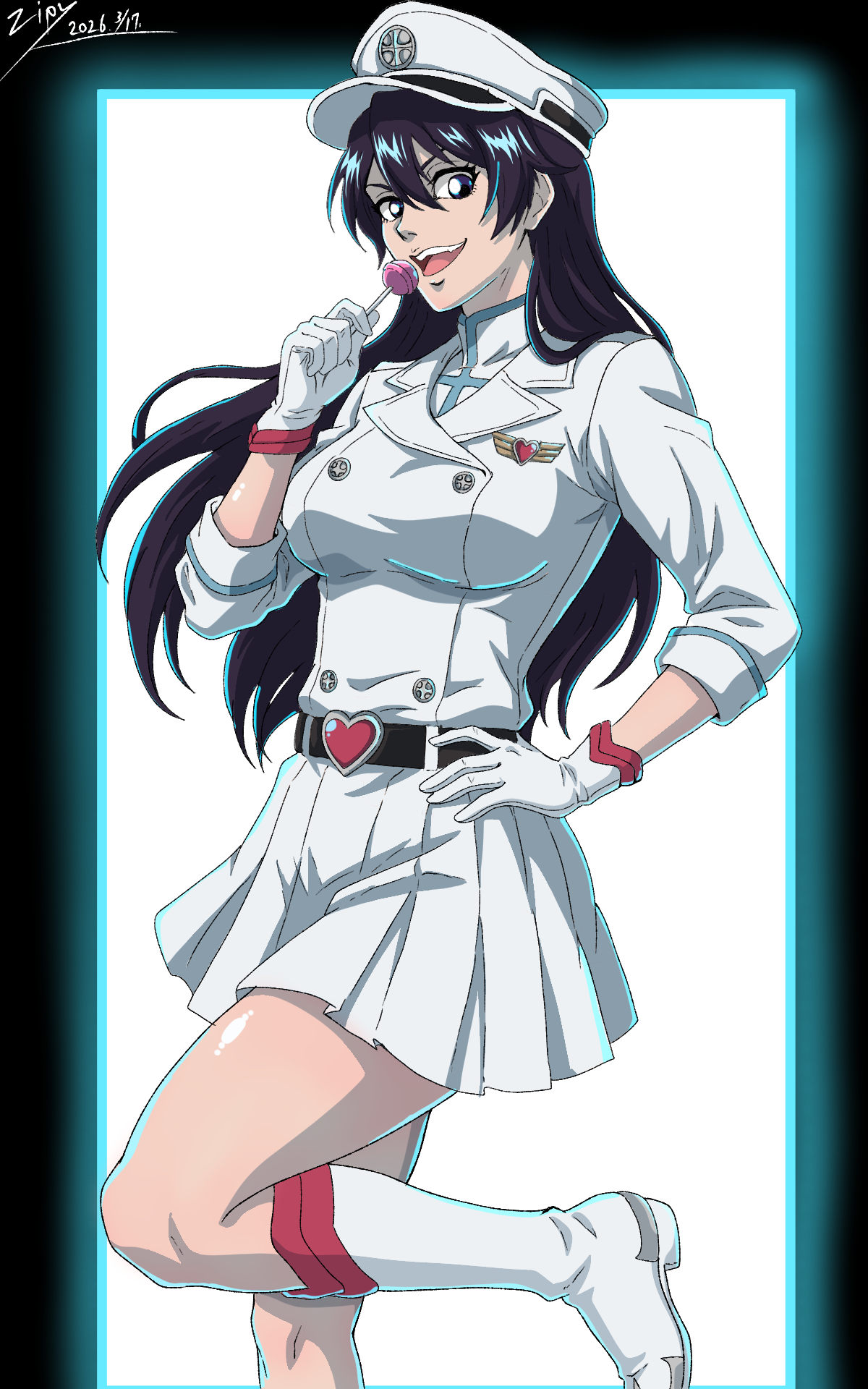 1girl artist_name bambietta_basterbine belt black_hair bleach bleach:_sennen_kessen-hen boots breasts buckle buttons candy dated female_focus food hand_on_own_hip heart heart-shaped_buckle knee_boots lollipop long_hair medium_breasts open_mouth quincy_(bleach) shiny_skin simple_background skirt solo solo_focus standing sternritter teeth tongue wandenreich wandenreich_uniform zipy