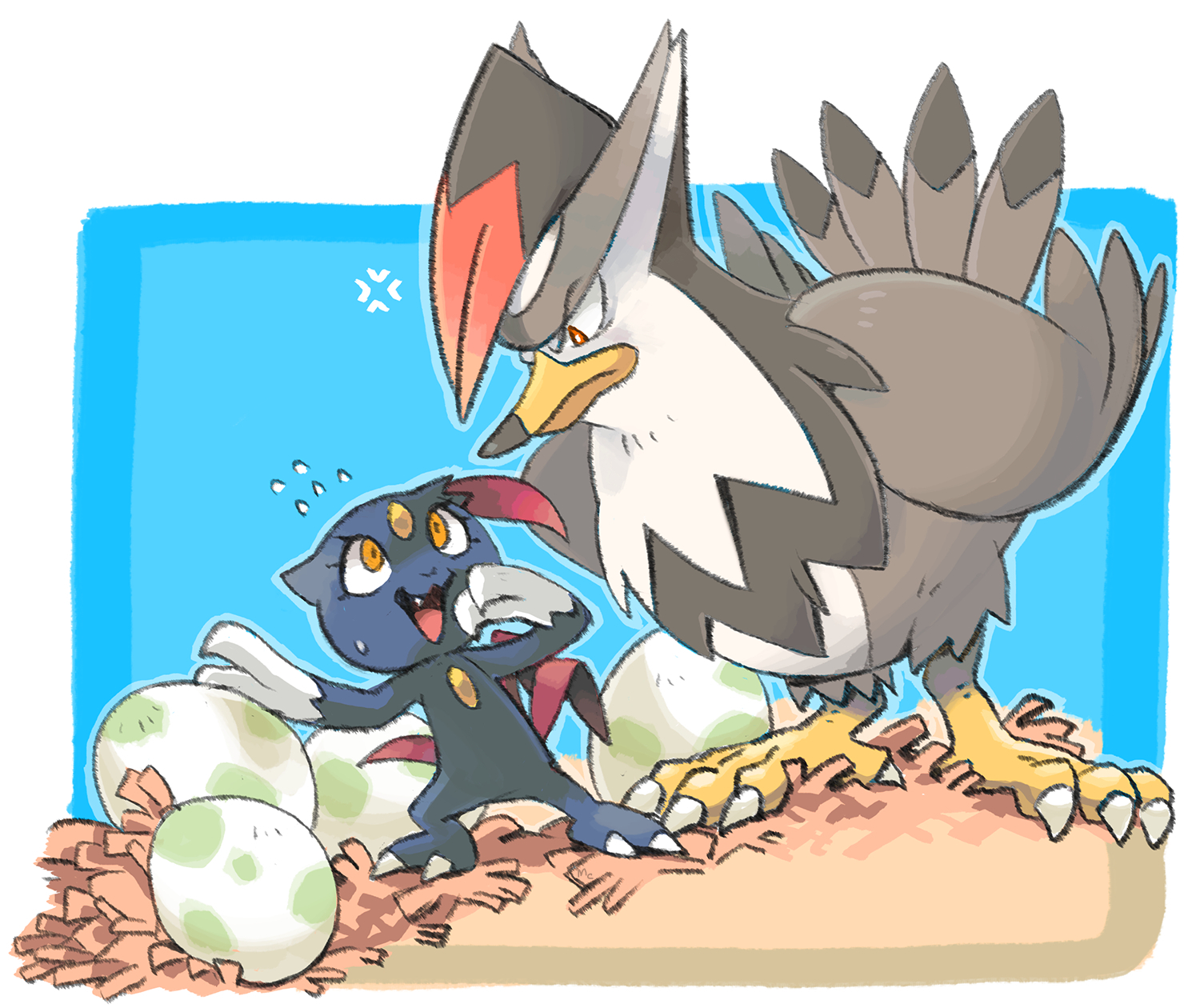 1other anger_vein angry closed_mouth commentary_request egg fang flying_sweatdrops full_body gen_2_pokemon gen_4_pokemon highres nintendo open_mouth pokemon pokemon_(creature) pokemon_egg red_eyes scared sim_sb_(pixiv121308470) sneasel staraptor yellow_eyes