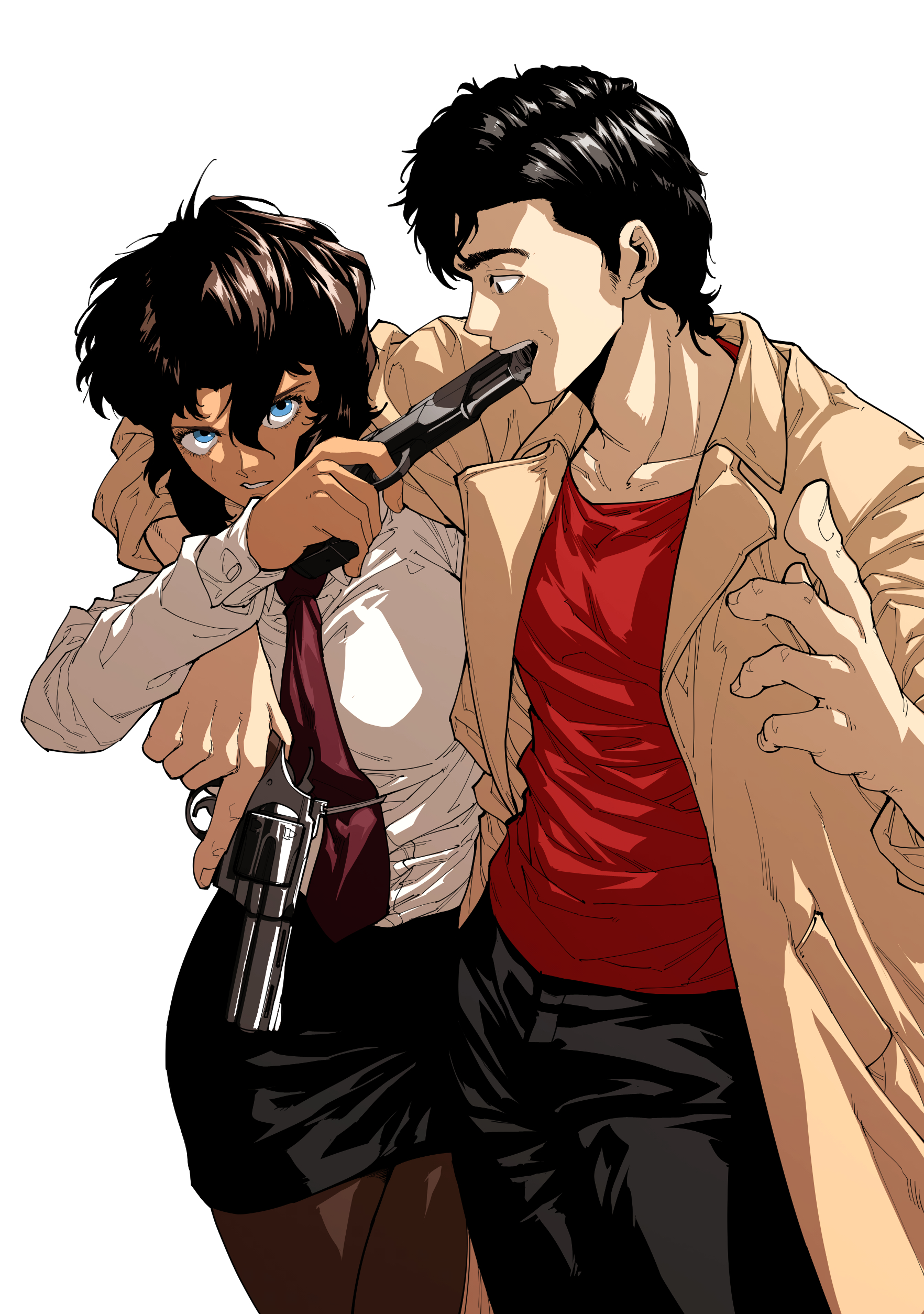 1boy 1girl absurdres aiming_at_another aiming_down angry arm_around_neck black_hair black_pants black_skirt blue_eyes bob_cut breasts brown_coat brown_hair brown_pantyhose city_hunter coat collarbone collared_shirt colt_python commentary cowboy_shot cz_75 dark-skinned_female dark_skin dress_shirt eyelashes finger_on_trigger gun gun_in_mouth gunsmith_cats hair_between_eyes hand_up handgun height_difference highres inverted_bob korean_commentary long_bangs looking_ahead looking_at_another medium_breasts messy_hair miniskirt necktie nervous open_clothes open_coat pants pantyhose rally_vincent red_necktie red_shirt revolver rocklobster52s saeba_ryou shirt short_hair side-by-side sidelocks simple_background skirt standing t-shirt tie_clip trench_coat trigger_discipline upturned_eyes v-shaped_eyebrows wavy_hair weapon white_background white_shirt