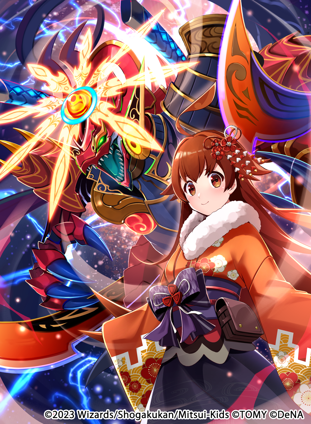 1girl 2023 ahoge brown_eyes brown_hair closed_mouth commentary_request copyright_notice dragon duel_masters duel_masters_play's fanny_pack floral_print floral_print_kimono fur-trimmed_kimono fur_trim giant giant_monster hair_ornament highres huge_ahoge japanese_clothes kenko_(a143016) kimono kimono_skirt kokko_rupiko long_hair official_art print_kimono