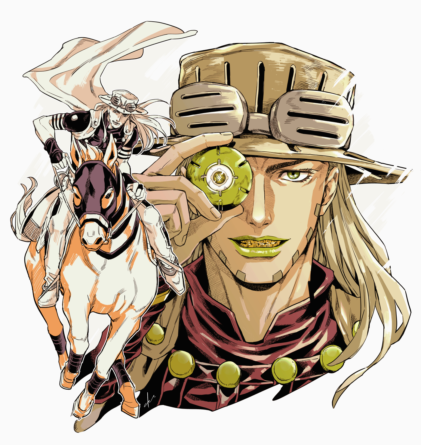2boys ball blonde_hair cape chaps commentary_request cowboy_hat dual_persona egg_(cknlun) goggles goggles_on_headwear green_eyes green_lips grills gyro_zeppeli hat highres holding holding_ball holding_reins horse horseback_riding jojo_no_kimyou_na_bouken long_hair male_focus multiple_boys reins riding steel_ball_(jojo) steel_ball_run valkyrie_(jojo)
