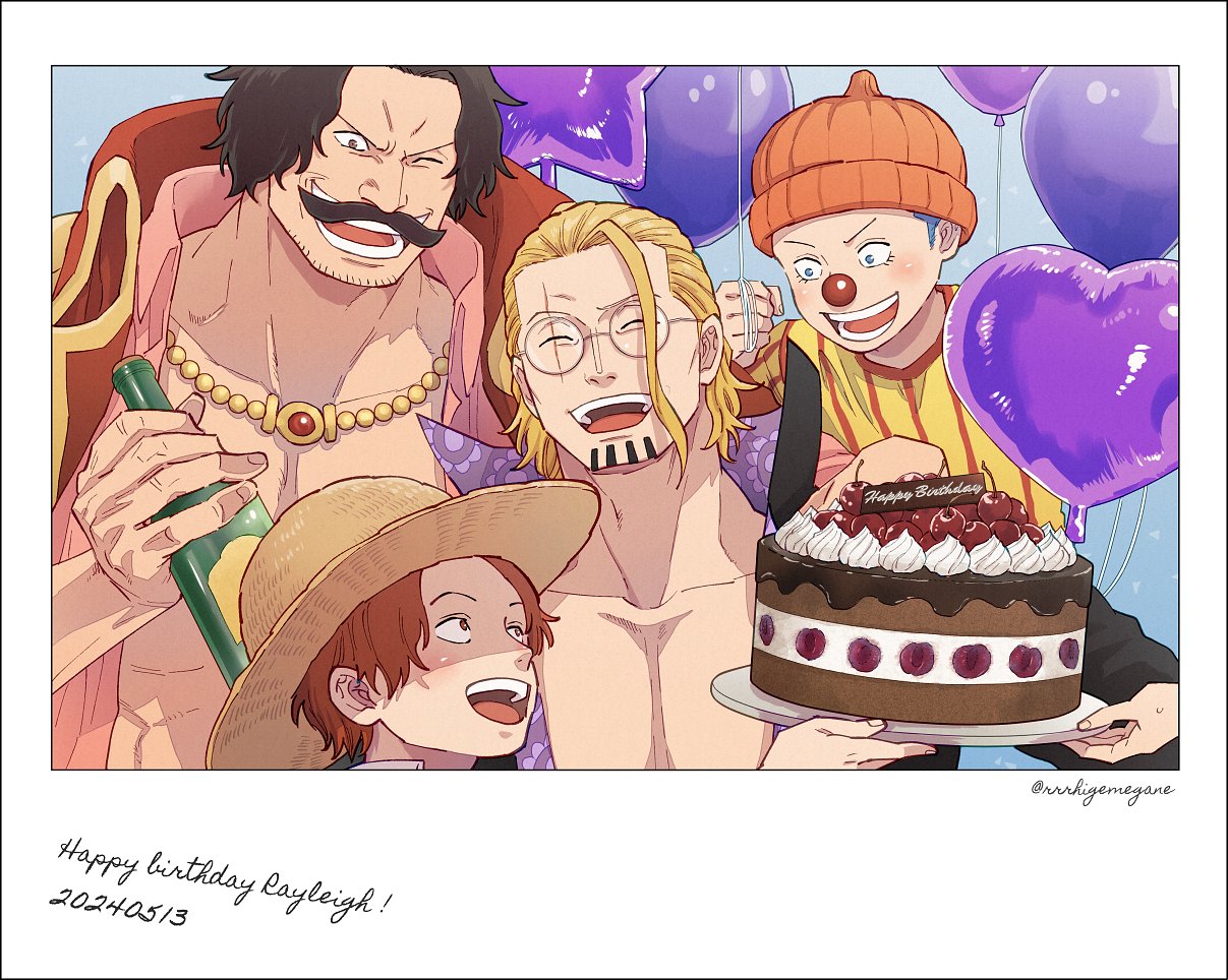 4boys balloon beanie black_hair blonde_hair blue_hair buggy_the_clown cake cherry clown_nose collarbone commentary_request dated facial_hair food fruit glasses goatee gol_d._roger handlebar_mustache happy_birthday hat heart_balloon holding holding_plate male_focus multiple_boys mustache one_piece open_mouth pectoral_cleavage pectorals plate red_hair rrrhigemegane scar scar_across_eye scar_on_face shanks_(one_piece) shirt sideburns silvers_rayleigh straw_hat striped_clothes striped_shirt yellow_shirt