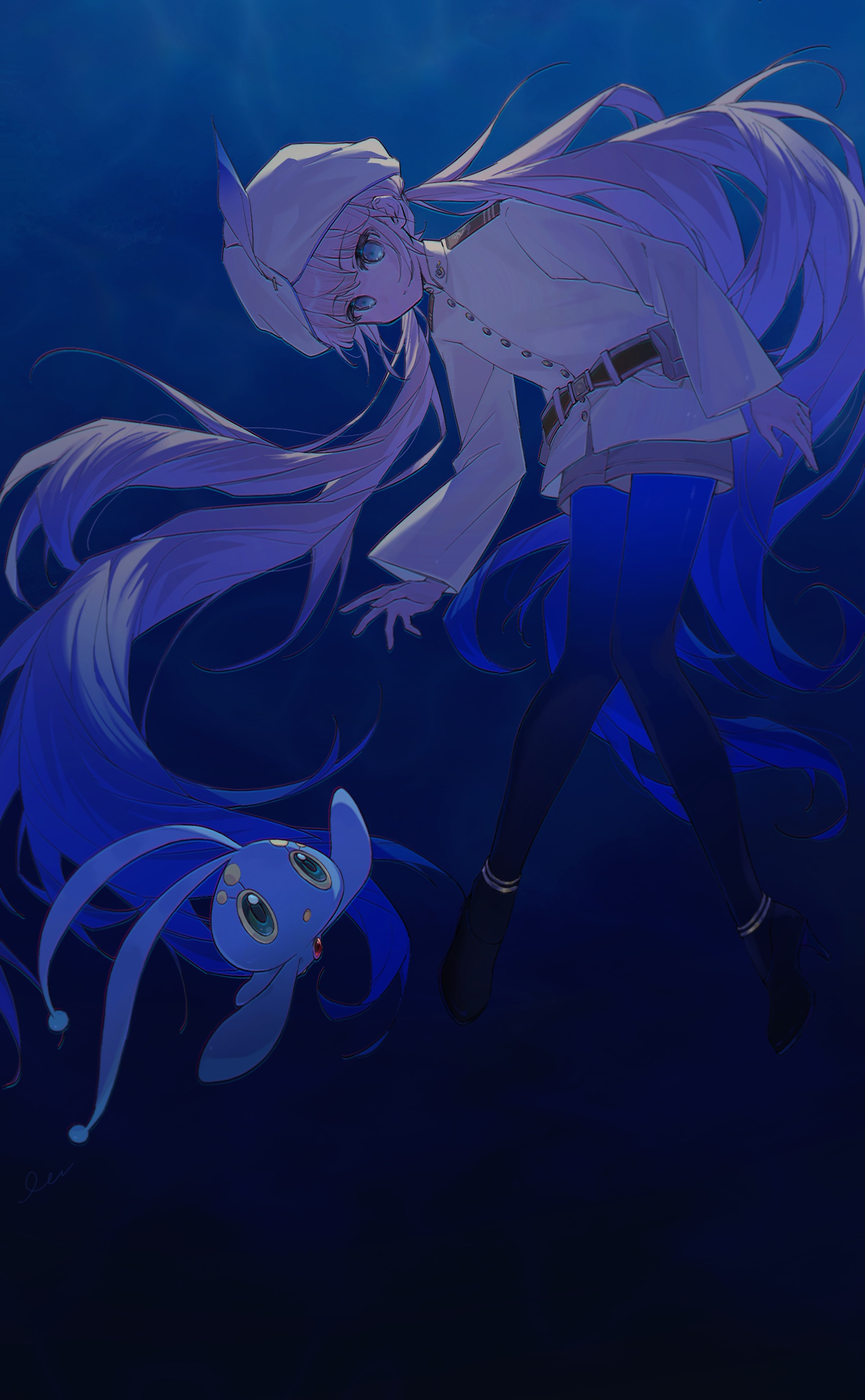 1boy absurdly_long_hair absurdres blue_eyes blue_pantyhose captain_nemo_(fate) commentary_request crossover fate/grand_order fate_(series) full_body gen_4_pokemon gradient_background hat_feather high_heels highres legendary_pokemon long_hair male_focus manaphy mythical_pokemon nemo_(fate) nintendo pantyhose pokemon pokemon_(creature) reaching reaching_towards_another su_dong_huo_ji trap turban twintails underwater very_long_hair white_turban