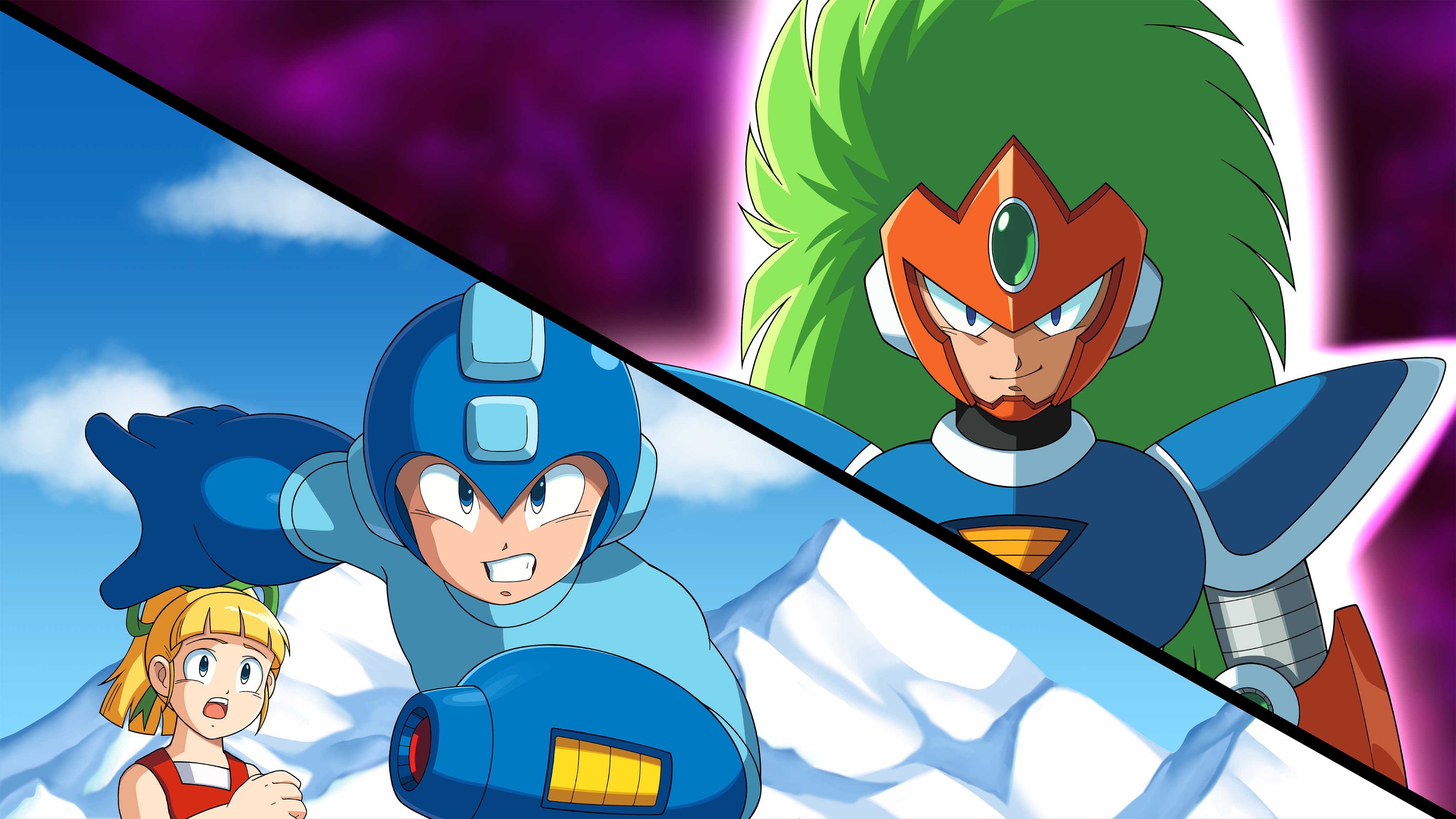 1girl 2boys absurdres android arm_cannon armor blonde_hair blue_armor blue_bodysuit blue_eyes blue_helmet bodysuit clenched_teeth closed_mouth diegodoodles evil_smile forehead_jewel glaring green_hair green_ribbon hair_ribbon helmet highres logo long_hair looking_at_viewer mega_man_(character) mega_man_(classic) mega_man_(series) mega_man_v mountain multiple_boys open_mouth orange_helmet ponytail ribbon robot roll_(mega_man) smile teeth terra_(mega_man) upper_teeth_only very_long_hair weapon