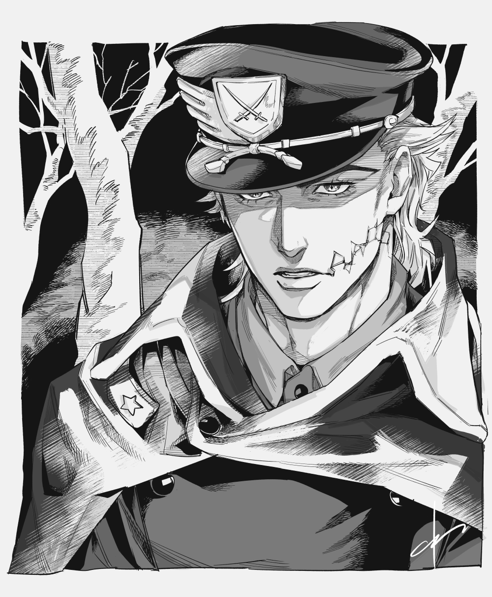 1boy alternate_costume cape commentary cracked_skin diego_brando egg_(cknlun) glasgow_smile hat highres jojo_no_kimyou_na_bouken male_focus military_hat military_uniform monochrome official_alternate_costume portrait scary_monsters_(stand) solo steel_ball_run