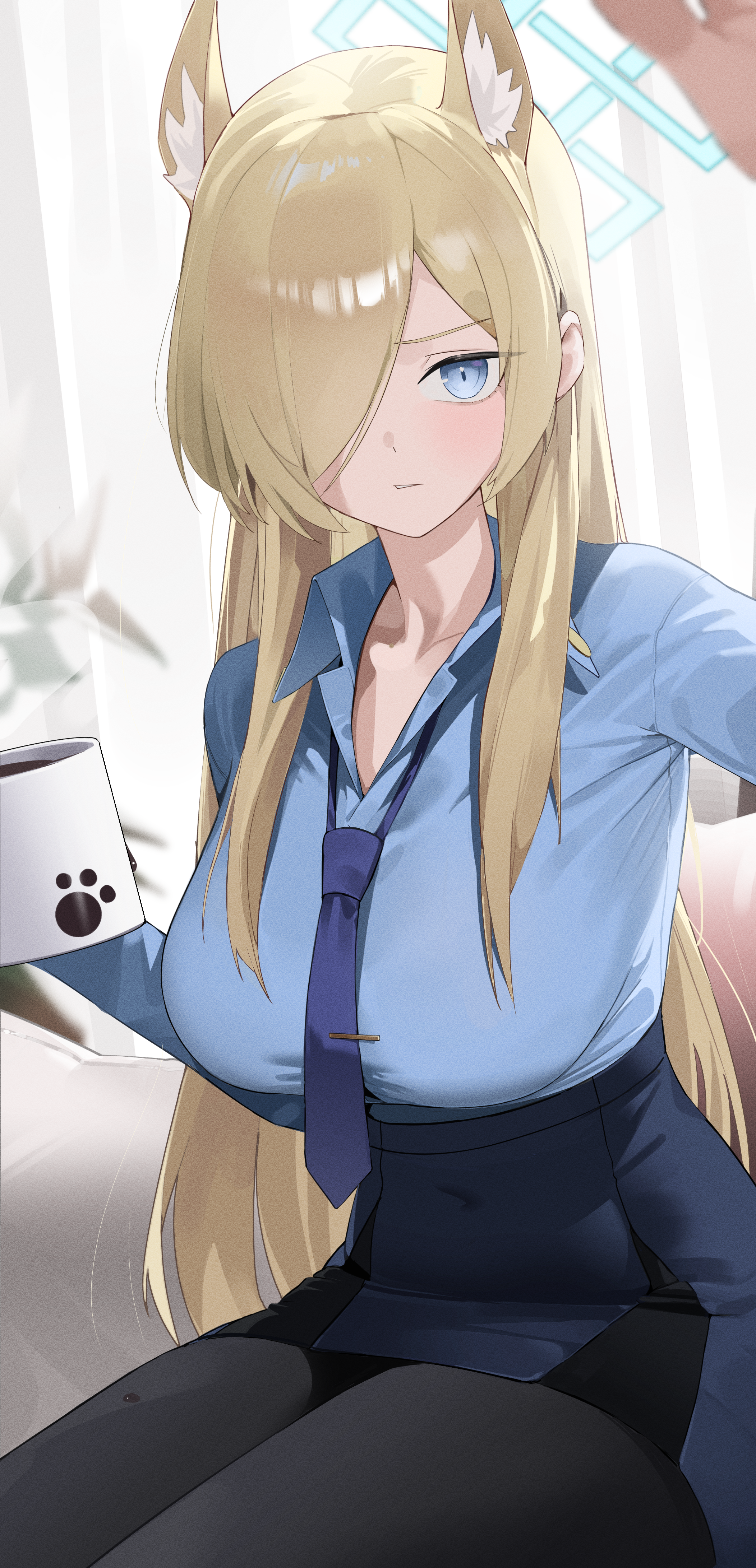 1girl absurdres animal_ear_fluff animal_ears arm_up black_pantyhose blue_archive blue_eyes blue_halo blue_shirt blue_skirt blurry blurry_background blurry_foreground blush breasts coffee collarbone collared_shirt commentary_request cowboy_shot cup dog_ears extra_ears hair_over_one_eye halo hand_up high-waist_skirt highres holding holding_cup indoors kanna_(blue_archive) korean_commentary large_breasts long_hair long_sleeves looking_at_viewer loose_necktie miniskirt mug necktie one_eye_covered pantyhose parted_lips paw_print pencil_skirt plant print_mug purple_necktie reaching reaching_towards_viewer seueo shirt sitting skirt solo tie_clip very_long_hair