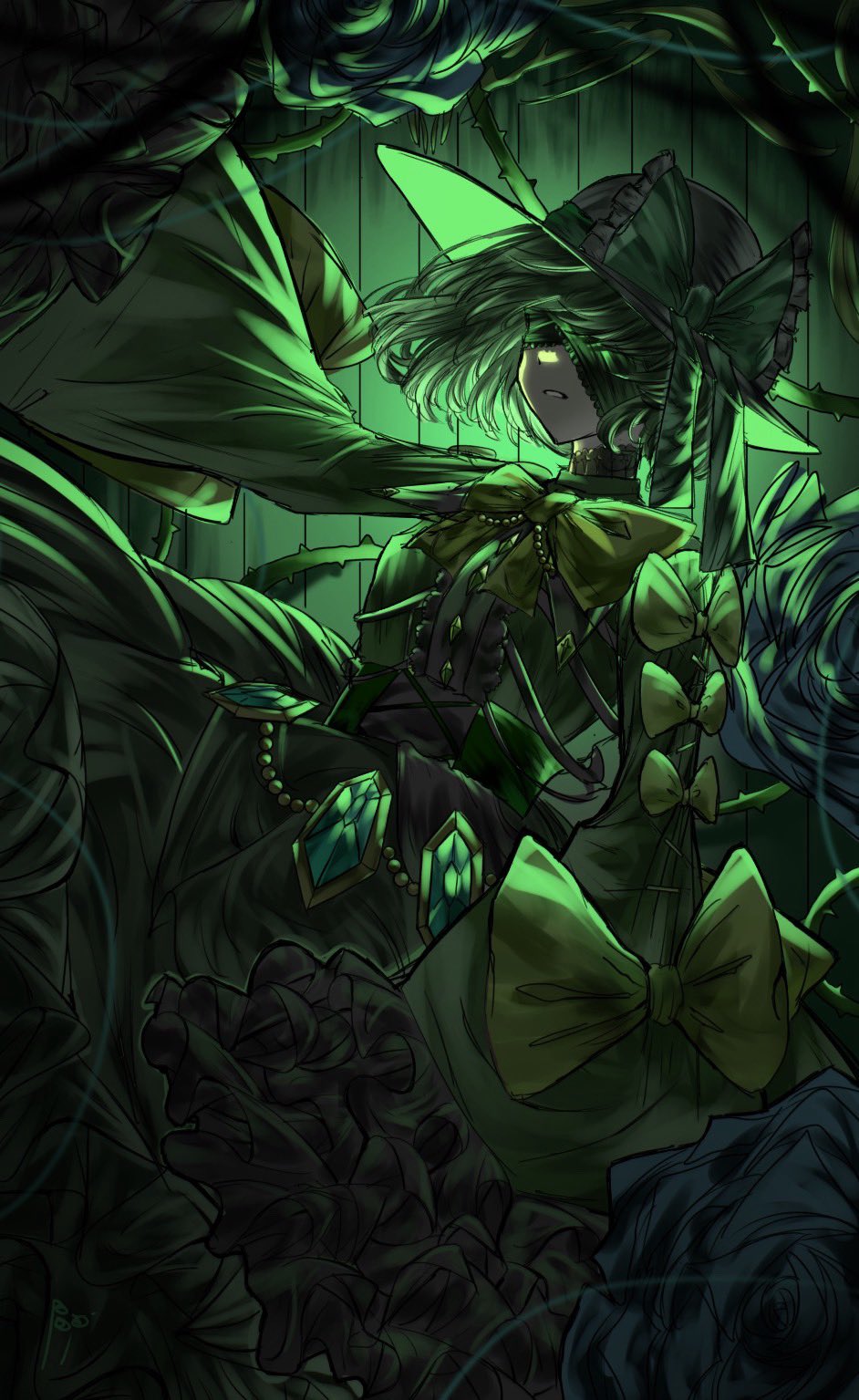 1girl black_hat blindfold bow bowtie buttons colored_blindfold commentary_request corset covered_eyes diamond_button dress flower frilled_dress frilled_ribbon frills green_bow green_bowtie green_corset green_dress green_hair green_ribbon gy9vxciahg25405 hat hat_ribbon highres komeiji_koishi plant ribbon rose sleeve_bow sleeves_past_wrists touhou vines wide_sleeves