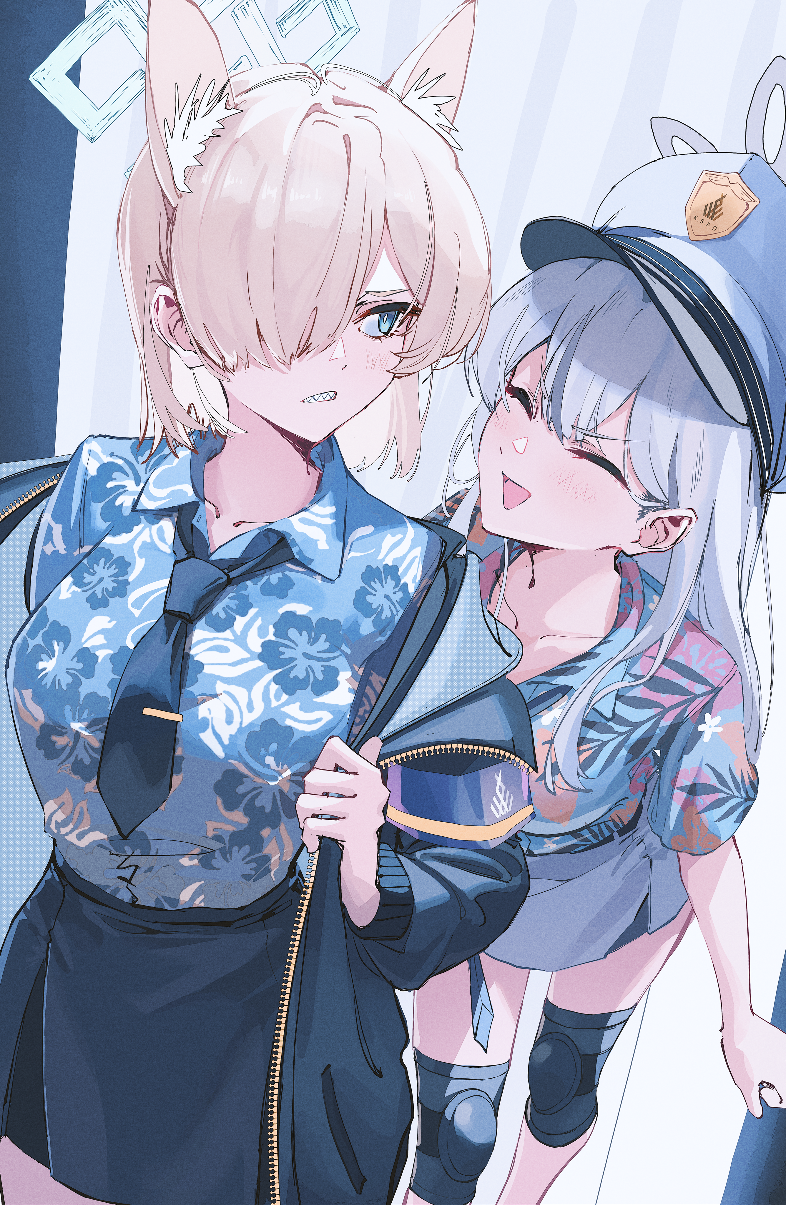 2girls absurdres alternate_costume alternate_hair_length alternate_hairstyle animal_ear_fluff animal_ears blonde_hair blue_archive blue_halo blue_jacket blue_necktie blue_shirt blue_skirt blush clenched_teeth closed_eyes commentary_request dog_ears dog_girl eironeus floral_print_shirt grey_hair grey_halo hair_over_one_eye halo highres jacket kanna_(blue_archive) knee_pads konoka_(blue_archive) long_hair looking_at_another multiple_girls necktie open_clothes open_jacket open_mouth sharp_teeth shirt short_hair skirt teeth