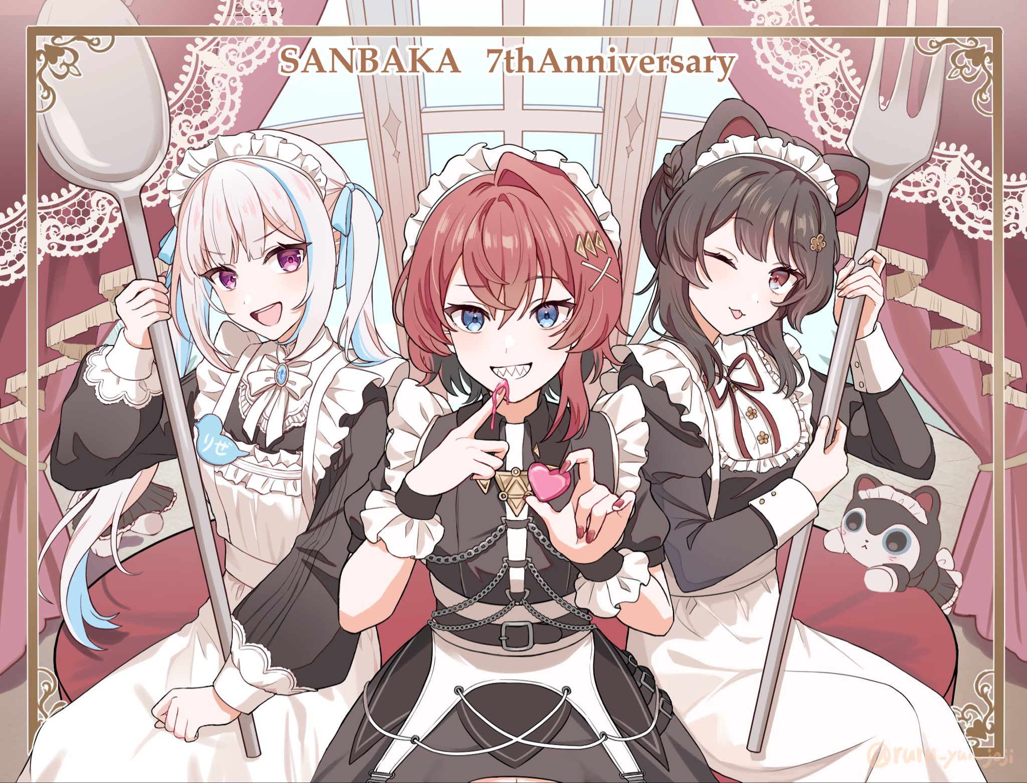 3girls :3 :d ange_katrina animal_ears anniversary apron banken_(inui_toko) belt bib_collar black_belt black_dress black_hair black_wrist_cuffs blue_eyes blue_hair blue_ribbon bow bowtie brown_hair colored_inner_hair commentary_request curtains dog_ears dress food_on_hand fork frilled_apron frilled_wrist_cuffs frills grin group_name group_picture hair_between_eyes hair_intakes hair_ornament hair_ribbon hand_on_lap hand_up hands_up heart highres holding holding_fork holding_heart holding_spoon inui_toko inui_toko_(western_maid) juliet_sleeves lize_helesta lize_helesta_(9th_costume) long_sleeves looking_at_viewer maid maid_apron maid_headdress medium_hair multicolored_hair multiple_girls nail_polish name_tag neck_ribbon nijisanji official_alternate_costume one_eye_closed open_mouth oversized_fork oversized_spoon puffy_long_sleeves puffy_short_sleeves puffy_sleeves purple_eyes red_eyes red_hair red_nails red_ribbon ribbon ruru_yui_joji sanbaka_(nijisanji) sharp_teeth short_sleeves sitting sleeve_cuffs smile spoon streaked_hair teeth triangle_hair_ornament twintails twitter_username two-tone_hair updo virtual_youtuber waist_apron white_apron white_bow white_bowtie white_hair white_headdress window wrist_cuffs x_hair_ornament
