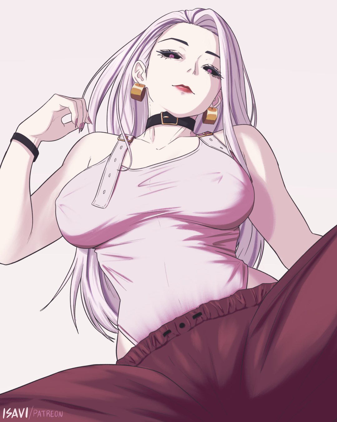 1girl black_sclera breasts choker colored_sclera covered_erect_nipples earrings hoop_earrings isavi jewelry jujutsu_kaisen leotard leotard_under_clothes lipstick looking_at_viewer looking_down makeup nipples pants pink_eyes pink_hair pink_leotard red_lips red_pants solo taut_leotard uro_takako
