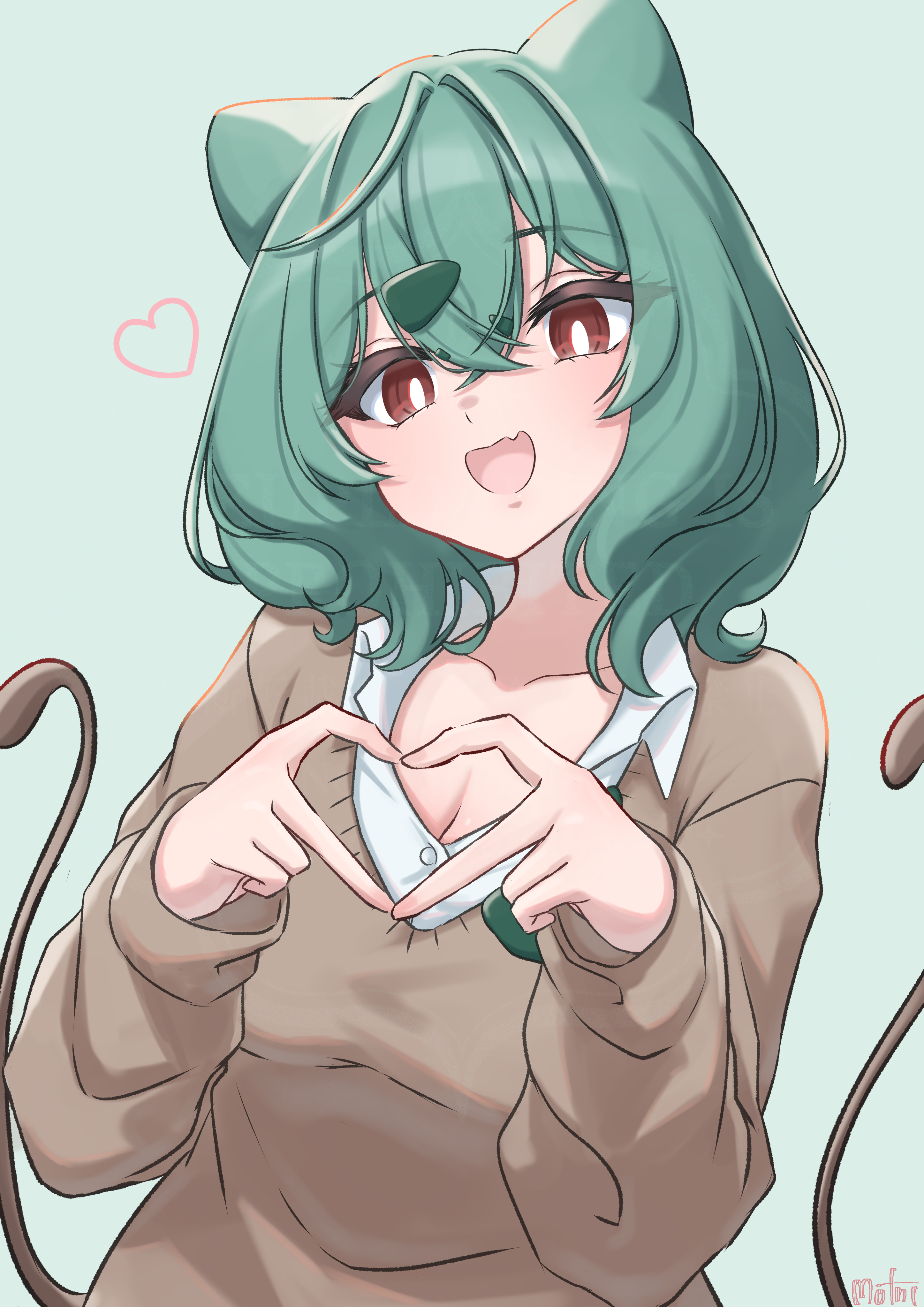 1girl :d absurdres animal_ears breasts bright_pupils brown_sweater bulbasaur cleavage collarbone collared_shirt commentary_request gen_1_pokemon green_background green_hair gyaru_bulbasaur hair_between_eyes hands_up happy heart heart_hands highres long_sleeves medium_hair mochitaro_(mothitaroo) nintendo open_mouth personification pokemon red_eyes shirt smile solo sweater upper_body white_pupils white_shirt