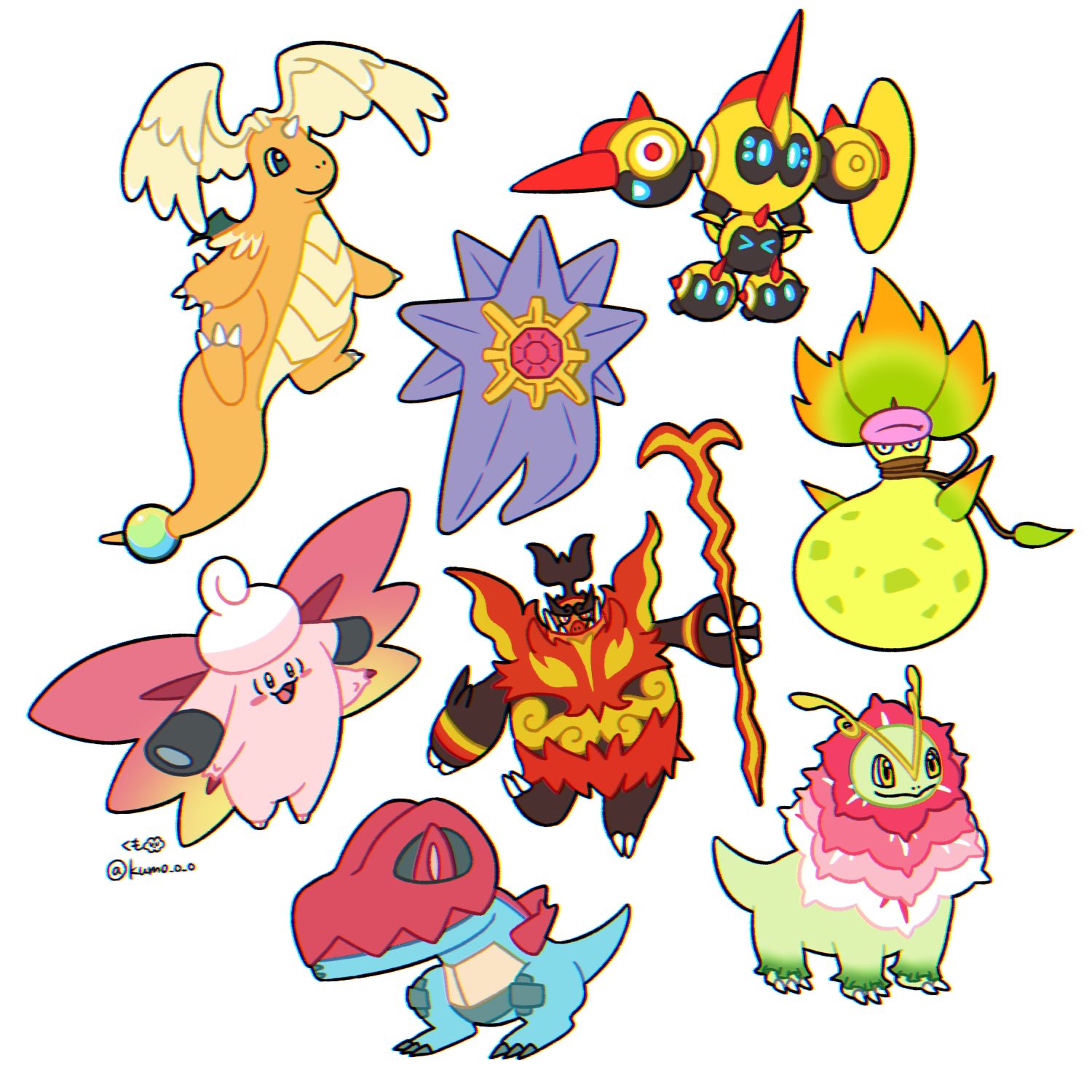 6+others clefable commentary dragonite emboar falinks feraligatr fire full_body gen_1_pokemon gen_2_pokemon gen_5_pokemon gen_8_pokemon head_wings highres kumo_o_o mega_clefable mega_dragonite mega_emboar mega_falinks mega_feraligatr mega_meganium mega_pokemon mega_starmie mega_victreebel meganium multiple_others nintendo pokemon pokemon_(creature) simple_background starmie twitter_username victreebel white_background wings