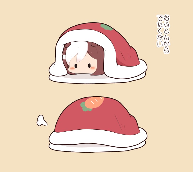 1girl animal_ears blush brown_hair carrot_print chibi chibi_only commentary_request ears_down food_print gomashio_(goma_feet) horse_ears horse_girl multicolored_hair no_mouth on_bed pink_background puff_of_air short_hair simple_background special_week_(umamusume) translation_request two-tone_hair umamusume white_hair |_|