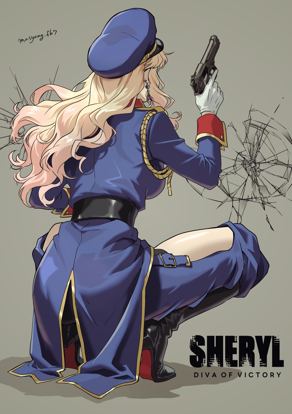1girl aiguillette artist_name black_boots blonde_hair boots character_name clothing_cutout crack earrings english_text epaulettes from_behind full_body gloves goddess_of_victory:_nikke grey_background gun handgun hat high_heel_boots high_heels highres holding holding_gun holding_weapon jewelry long_hair macross macross_frontier meme military_hat military_uniform nikke's_shooting_pose_(meme) peaked_cap ryu_(masu_nantoka-san) sheryl_nome simple_background sitting solo squatting thigh_cutout weapon white_gloves
