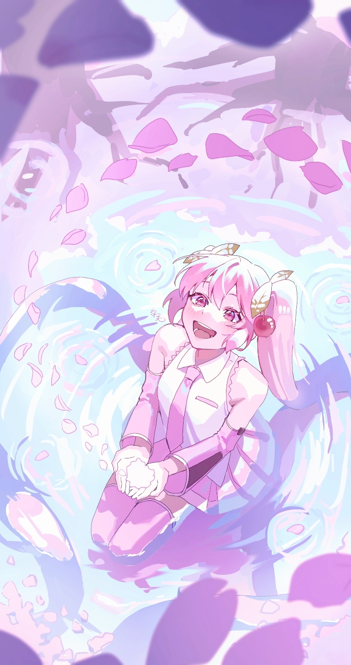 1girl bare_shoulders blush breasts cherry_blossoms cherry_hair_ornament collarbone collared_shirt commentary_request detached_sleeves flower food-themed_hair_ornament hair_between_eyes hair_ornament hatsune_miku highres imkooooww long_hair looking_up medium_breasts necktie open_mouth pink_eyes pink_flower pink_hair pink_necktie pink_skirt pink_sleeves pleated_skirt sakura_miku shirt skirt sleeveless sleeveless_shirt smile solo twintails upper_body very_long_hair vocaloid water white_trim