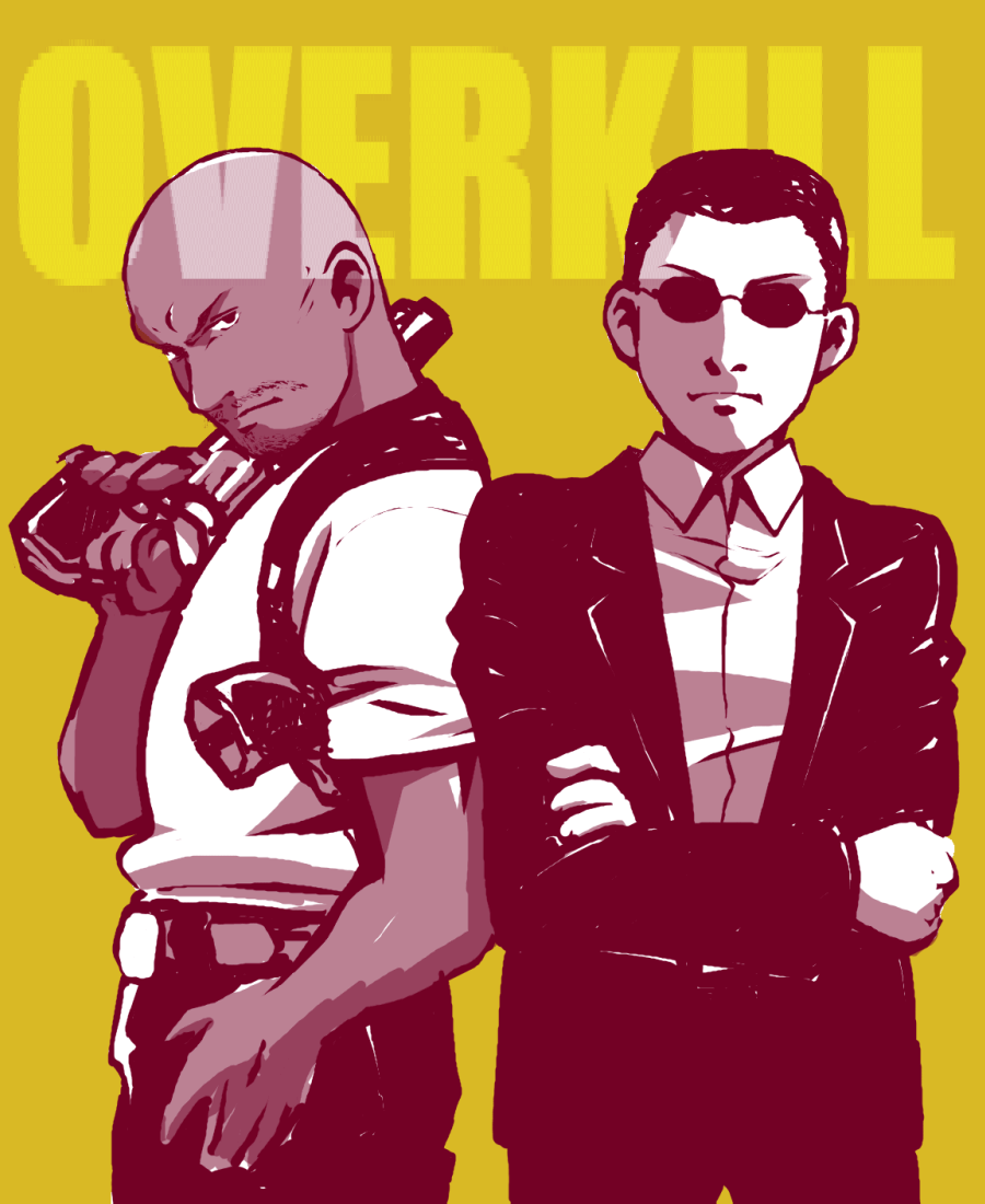 2014 2boys angry bald belt black_hair business_suit dark-skinned_male dark_skin formal_clothes g_(house_of_the_dead) glasses gun holster house_of_the_dead isaac_washington male_focus multiple_boys pungis sega serious shoulder_holster suit weapon yellow_background