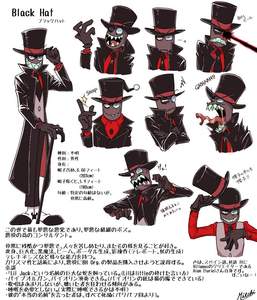 1boy black_coat black_hat black_hat_(villainous) black_necktie black_pants buttons cane character_name coat collared_shirt colored_skin commentary_request english_text eye_beam finger_wrap full_body grey_skin grey_vest grin hand_up hat holding holding_cane looking_to_the_side male_focus mitch_cataro monocle multiple_views necktie open_clothes open_coat open_mouth pants red_shirt sharp_teeth shirt smile standing teeth tongue tongue_out top_hat translation_request vest villainous