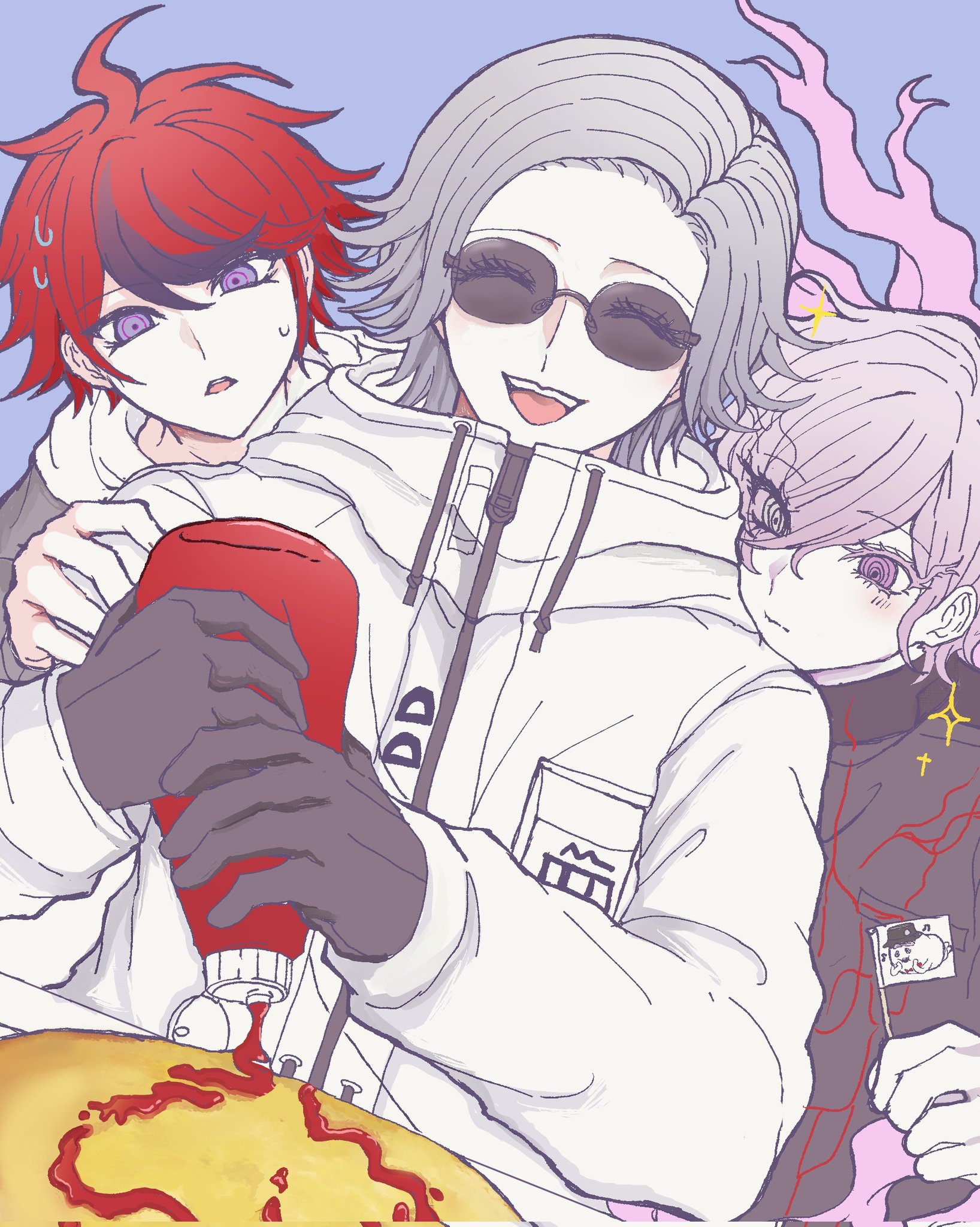 3boys :d ^_^ ahoge aotsuki_eito black_gloves black_hair black_jacket black_streaks blue_eyes bottle breast_pocket character_print closed_eyes eyes_visible_through_hair fire flag food food_art gakuran gloves grey_hair grey_jacket hair_over_one_eye highres holding holding_bottle holding_flag hood hoodie jacket jacket_over_hoodie ketchup_bottle male_focus multicolored_hair multiple_boys nervous_sweating open_mouth pink_eyes pink_fire pocket purple_background red_hair school_uniform shi_gu_(sigu_69) shion_(hundred_line) short_hair sirei_(hundred_line) smile sparkle streaked_hair sumino_takumi sunglasses sweat the_hundred_line_-last_defense_academy- two-tone_hair white_eyes white_hoodie white_jacket