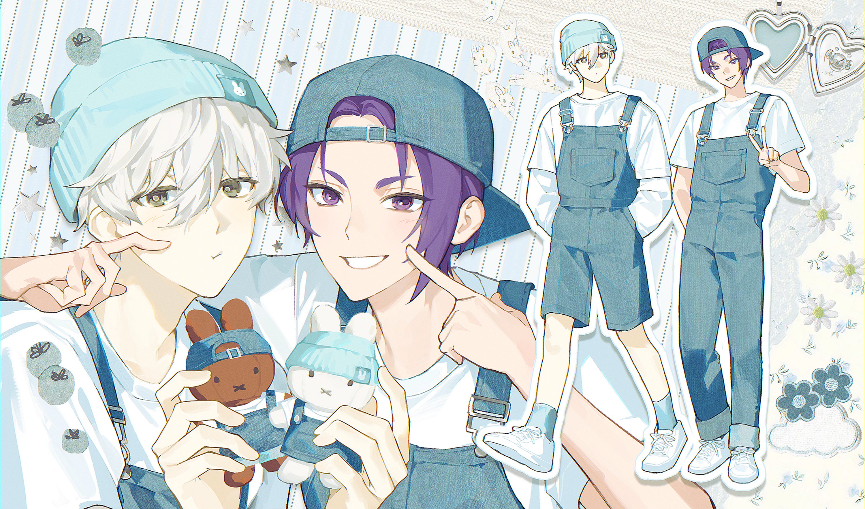 2boys asymmetrical_bangs backwards_hat ballro beanie blue_background blue_hat blue_lock blue_overalls blue_socks brown_eyes closed_mouth cloud finger_to_another's_cheek flower full_body hands_in_pockets hat heart highres holding holding_stuffed_toy index_finger_raised light_blush long_sleeves looking_at_another looking_at_viewer messy_hair miffy miffy_(character) mikage_reo multiple_boys nagi_seishirou outline overall_shorts overalls portrait purple_eyes purple_hair shirt shoes short_hair short_sleeves smile socks star_(symbol) stuffed_animal stuffed_toy teeth uneven_bangs white_hair white_outline white_shirt white_shoes