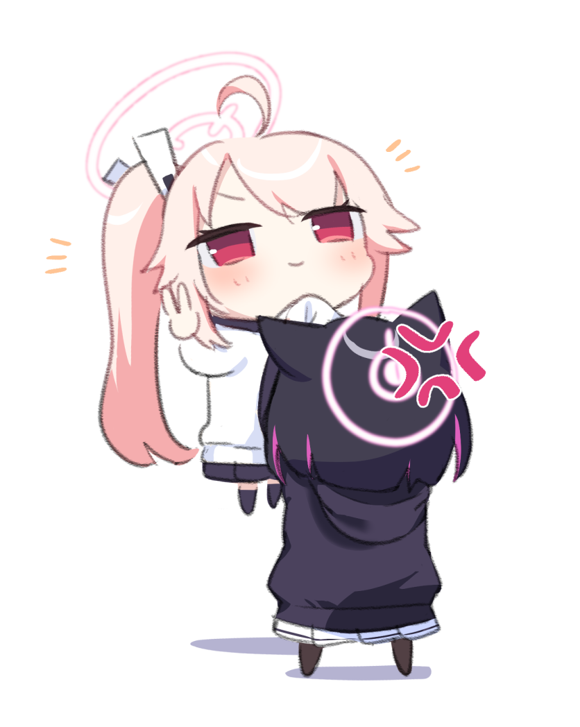 2girls ahoge anger_vein animal_ears black_hair black_hoodie black_jacket black_pantyhose black_sailor_collar black_skirt black_thighhighs blue_archive blush cat_ears cat_girl chibi chibi_only closed_mouth commentary_request doyagao facing_away halo hood hood_down hooded_jacket hoodie jacket kazusa_(blue_archive) kokone_(coconeeeco) lifting_person long_hair looking_at_viewer miniskirt multicolored_hair multiple_girls natsu_(blue_archive) notice_lines pantyhose pink_hair pink_halo pleated_skirt red_eyes sailor_collar school_uniform serafuku shadow shirt short_hair side_ponytail simple_background skirt smile smug thighhighs two-tone_hair v very_long_hair white_background white_shirt white_skirt