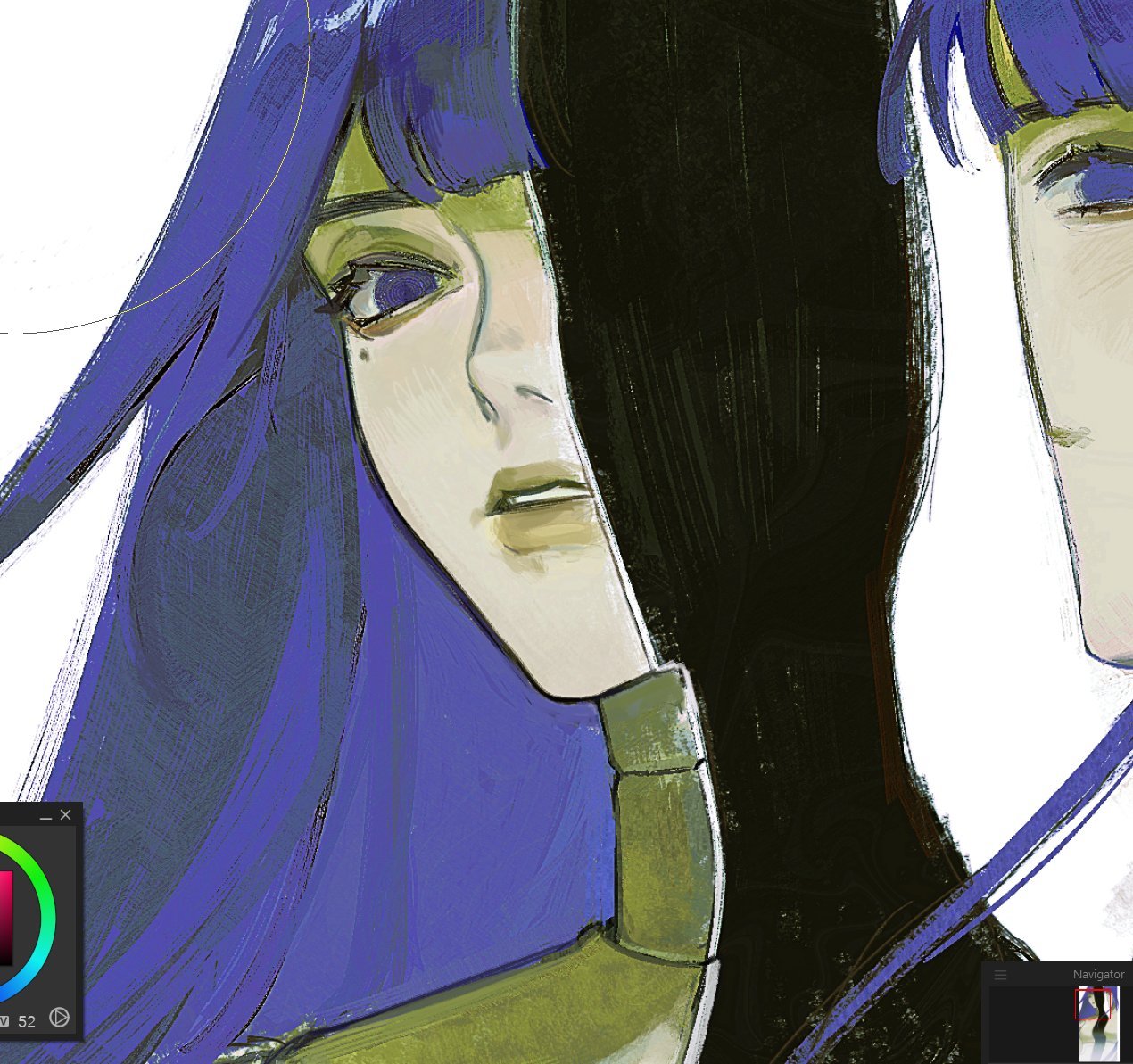 1girl blunt_bangs commentary empty_eyes english_commentary genshin_impact hair_down helvicas long_hair looking_at_viewer looking_to_the_side mole mole_under_eye parted_lips purple_eyes purple_hair raiden_shogun sketch solo split thick_lips unfinished upper_body white_background