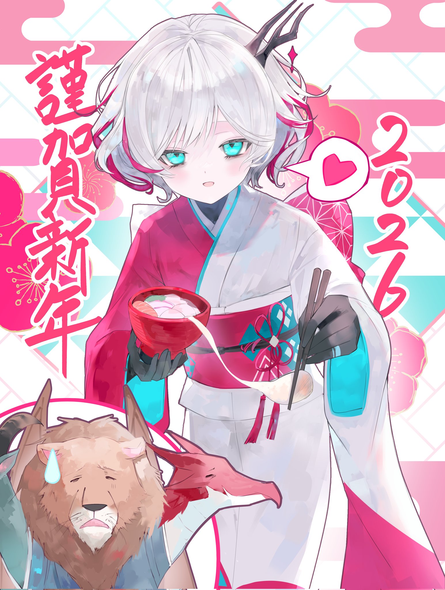 1girl black_gloves bowl chopsticks commentary_request croma_mhach dragon food gloves goat heart highres holding holding_bowl japanese_clothes kimono light_blush lion multicolored_hair multicolored_kimono sephie_(shadowverse) shadowverse short_hair smile speech_bubble streaked_hair sweatdrop white_hair wings