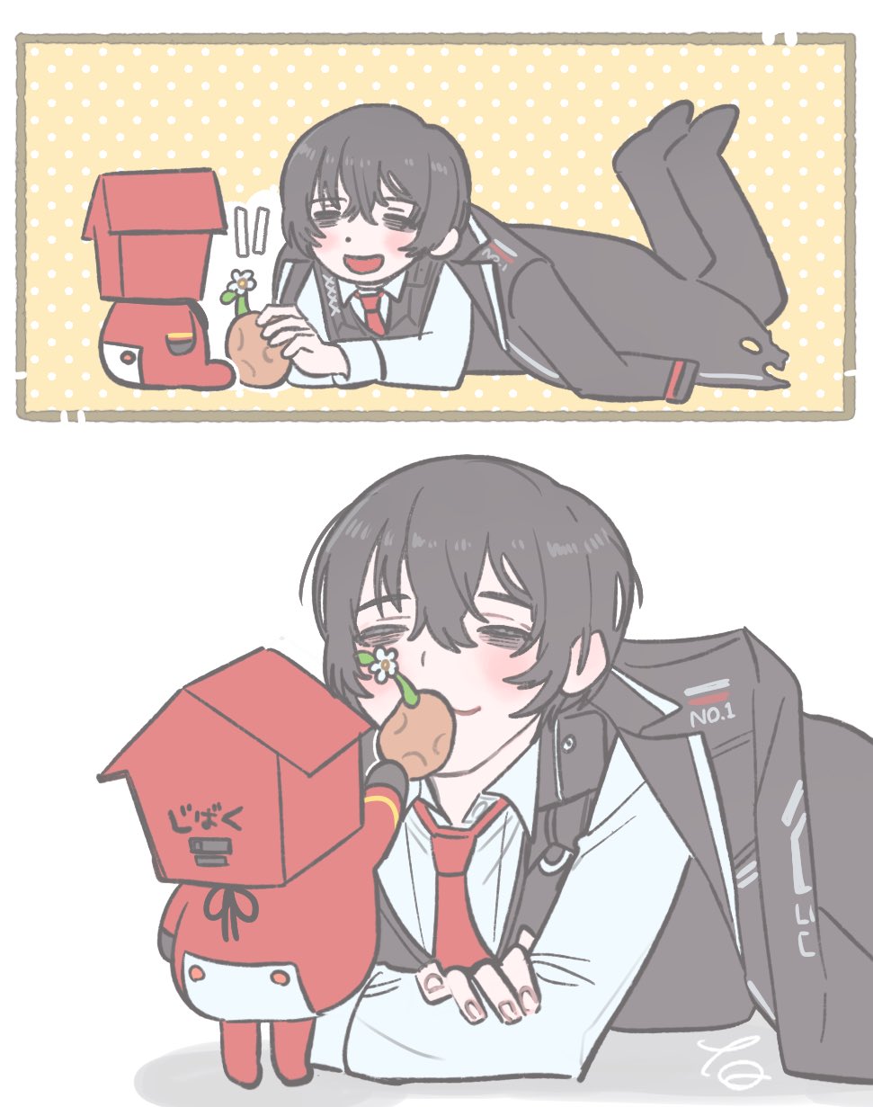 1boy 1other baby bags_under_eyes bib black_coat black_pants black_vest clock closed_eyes coat coat_on_shoulders commentary cuckoo_clock dante_(limbus_company) highres limbus_company long_sleeves lying on_stomach open_mouth pants potato project_moon red_trim ribbon shirt smile tama_launcher torn_clothes torn_coat translated vest white_shirt yi_sang_(project_moon)