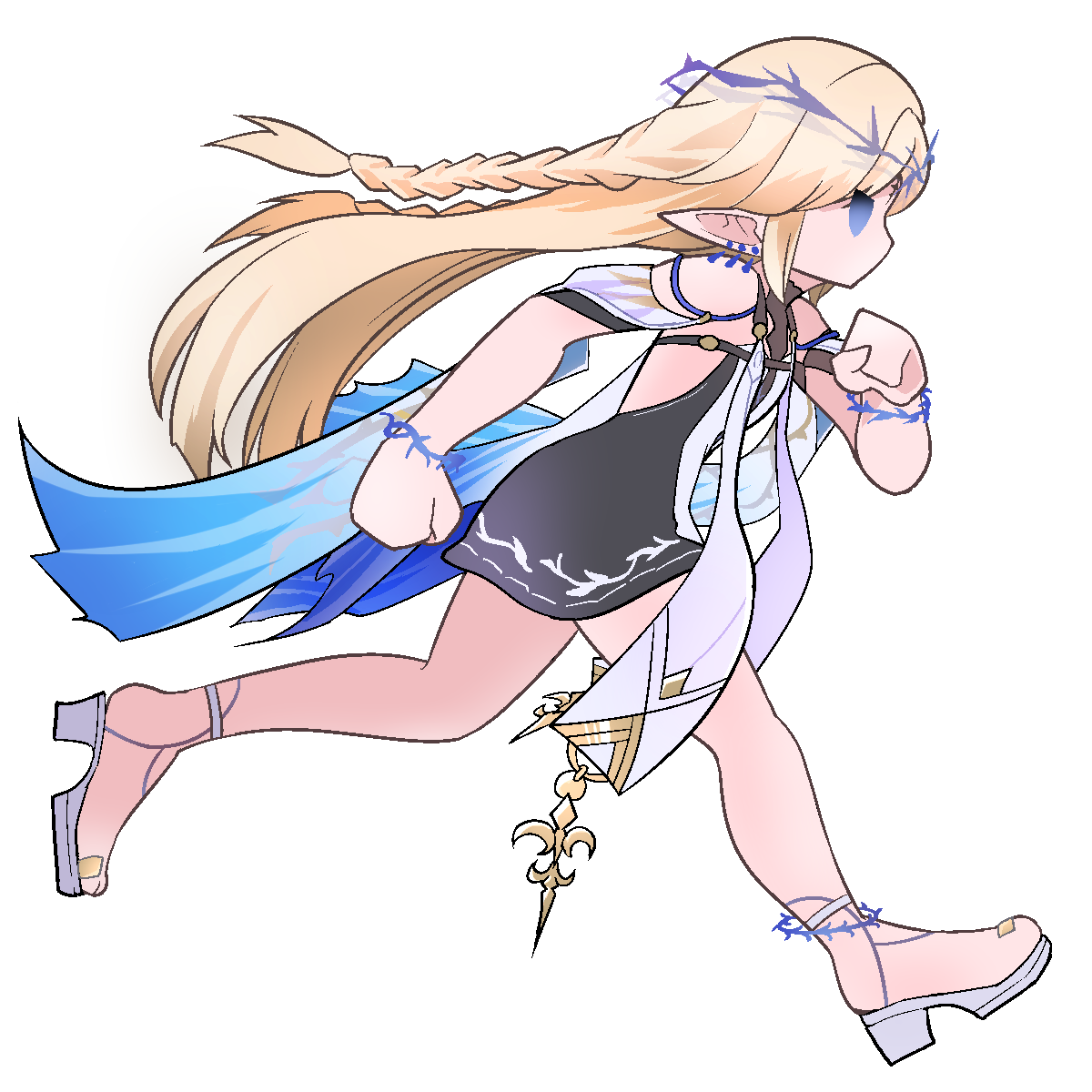 1girl bare_shoulders black_dress blonde_hair blue_eyes cartethyia_(wuthering_waves) commentary_request dorinhakawaii dress earrings full_body highres jewelry long_hair multiple_earrings pointy_ears running solo wuthering_waves