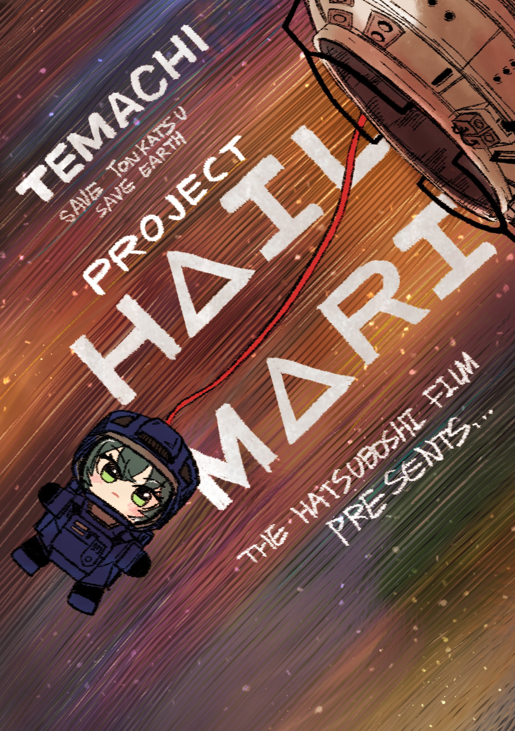 1girl absurdres aromdami astronaut chibi chibi_only commentary_request english_text gakuen_idolmaster green_eyes green_hair helmet highres idolmaster looking_at_viewer movie_poster_(medium) parody poster_(medium) poster_parody project_hail_mary solo space_helmet spacecraft spacesuit tsukimura_temari