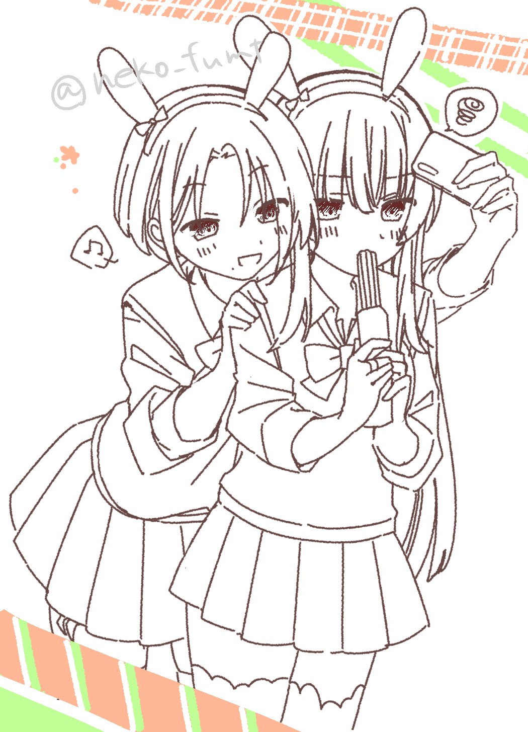 2girls animal_ears arm_up assault_lily behind_another benini blush bow bowtie cellphone churro closed_mouth collared_shirt commentary_request cowboy_shot eating eighth_note fake_animal_ears food greyscale_with_colored_background hair_between_eyes hairband hand_on_another's_shoulder hand_up hands_up highres holding holding_food holding_phone jewelry kagawa_makina leaning_forward long_hair looking_at_phone loose_bowtie miniskirt mole mole_under_mouth morimoto_yuni multiple_girls musical_note parted_bangs parted_lips phone pleated_skirt ring school_uniform selfie shirt short_hair skirt smartphone smile speech_bubble spoken_musical_note spoken_squiggle squiggle standing sweater_vest thighhighs three-quarter_sleeves twitter_username very_long_hair white_background