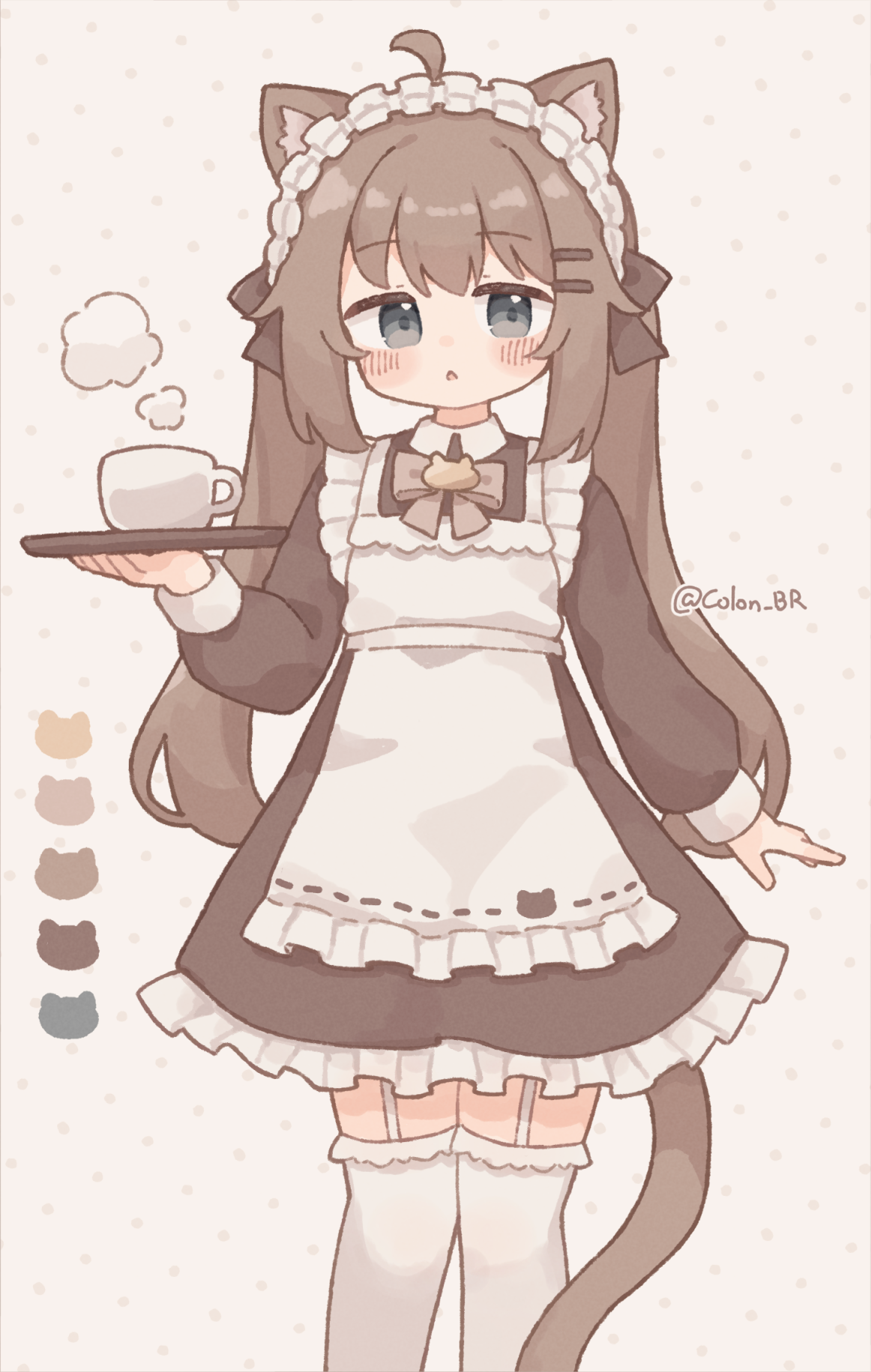 1girl ahoge animal_ears apron black_eyes bow bowtie brown_bow brown_bowtie brown_dress brown_hair cat_ears cat_girl cat_tail colon_br commentary_request cup dress feet_out_of_frame frilled_dress frills garter_straps highres holding holding_tray long_hair long_sleeves maid maid_apron maid_headdress open_mouth original polka_dot polka_dot_background puffy_long_sleeves puffy_sleeves simple_background solo standing tail teacup thighhighs tray twintails white_apron white_background white_garter_straps white_thighhighs