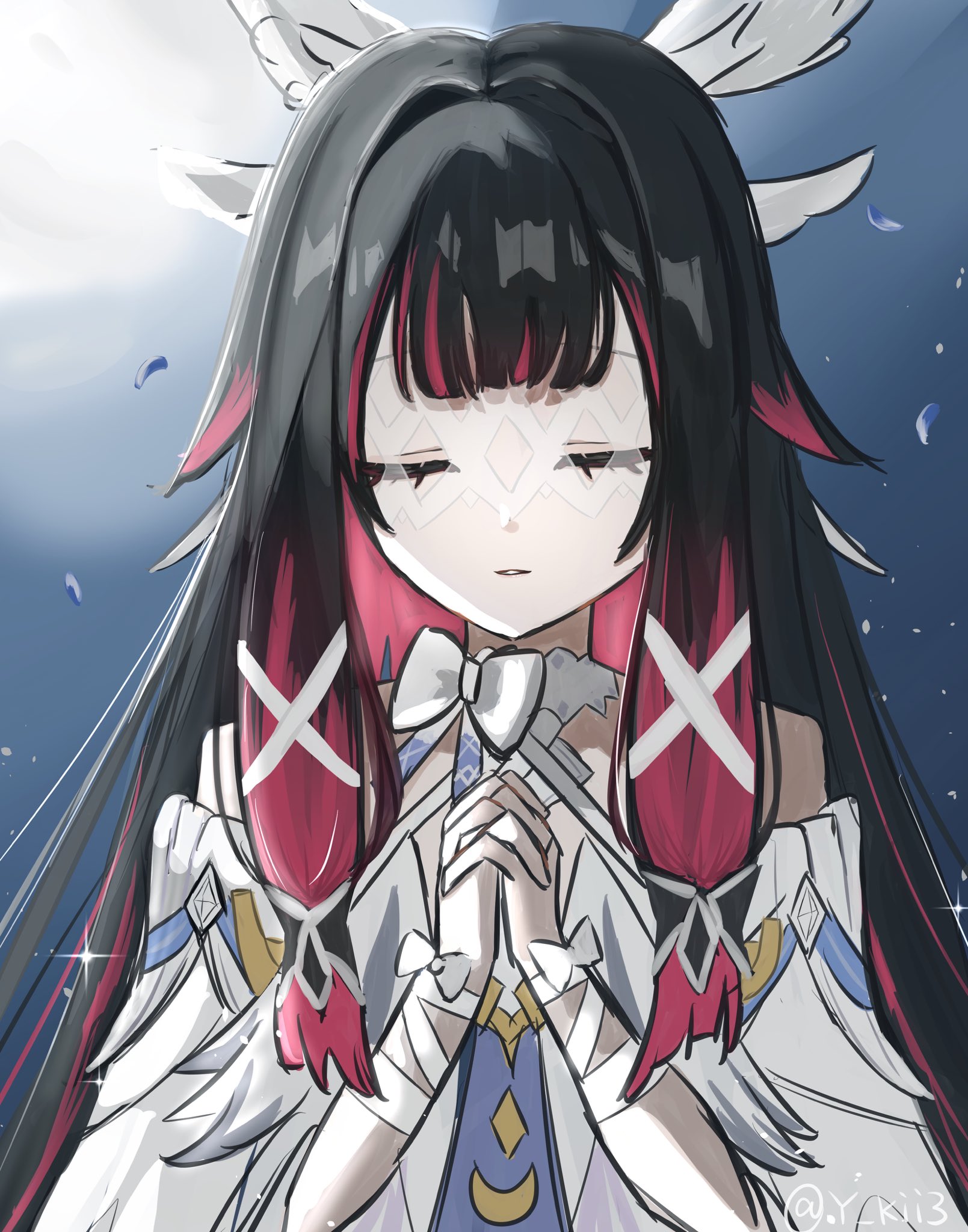 1girl bare_shoulders black_hair bow bowtie closed_eyes columbina_(genshin_impact) commentary dress eye_mask genshin_impact hair_ornament head_wings highres interlocked_fingers long_hair looking_at_viewer mask multicolored_hair multiple_wings purple_hair purple_streaks ribbon solo streaked_hair two-tone_hair upper_body very_long_hair white_bow white_dress white_wings wing_hair_ornament wings wrist_bow x-shaped_eyewear y_kii3