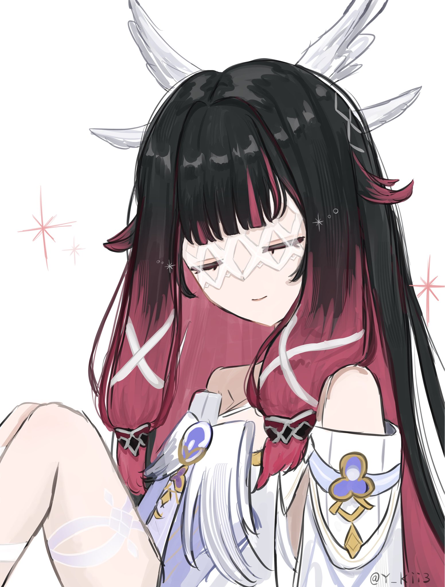 1girl bare_legs bare_shoulders black_hair closed_eyes closed_mouth columbina_(genshin_impact) commentary dress eye_mask from_side genshin_impact hair_ornament hair_ribbon head_wings highres knees_up long_hair mask multicolored_hair multiple_wings purple_hair purple_streaks ribbon simple_background sitting smile solo streaked_hair twitter_username two-tone_hair very_long_hair white_background white_dress white_wings wing_hair_ornament wings x-shaped_eyewear y_kii3