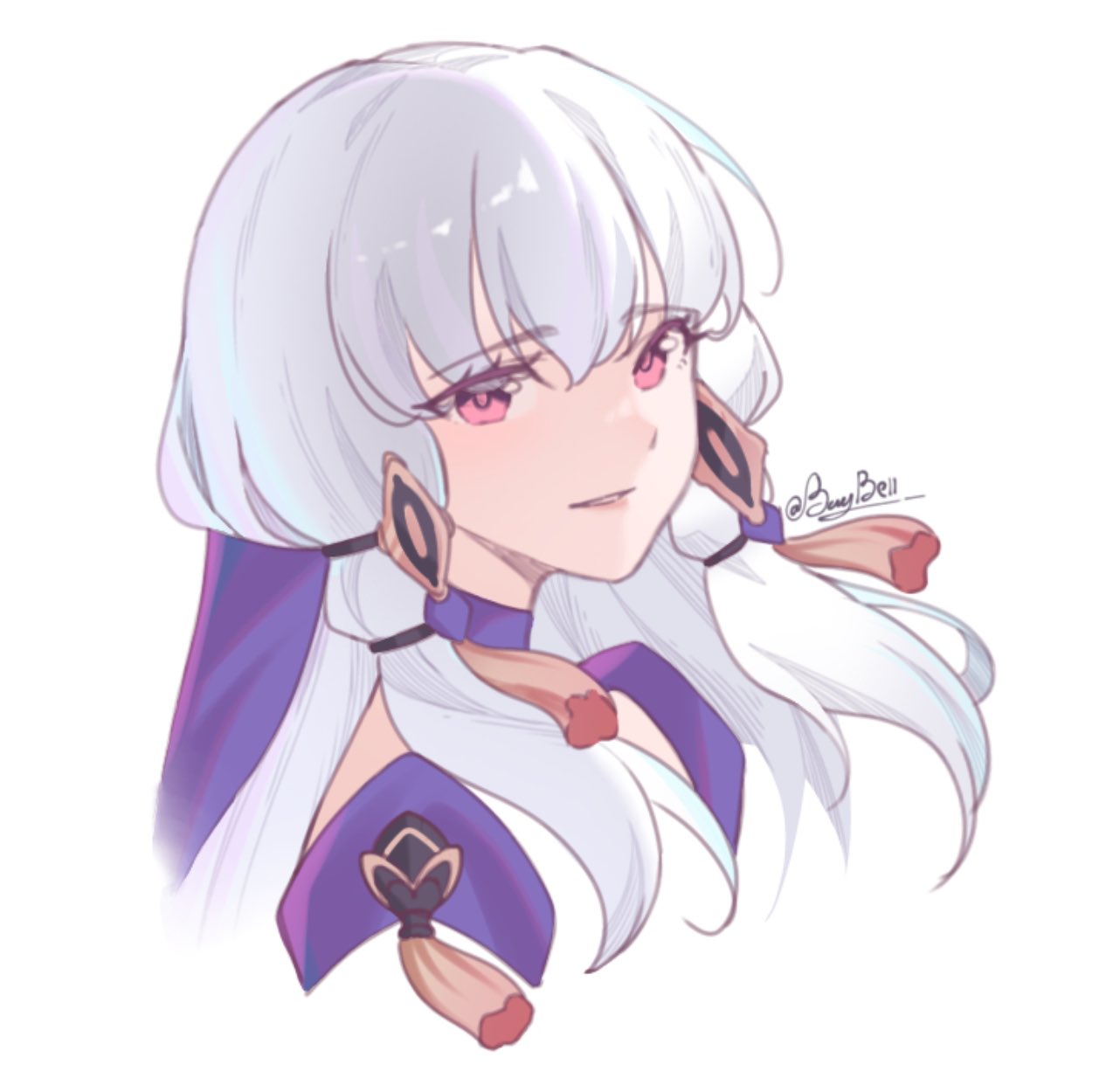 1girl baybell commentary fire_emblem fire_emblem:_three_houses hair_ornament highres long_hair looking_at_viewer lysithea_von_ordelia lysithea_von_ordelia_(timeskip) nintendo pink_eyes smile solo tassel tassel_hair_ornament untranslatable_commentary white_hair