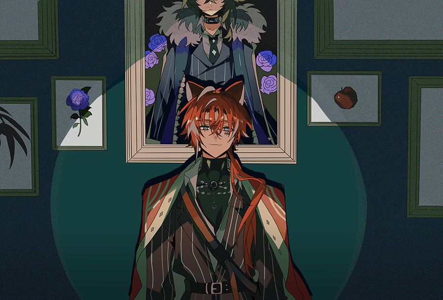 2boys apple arknights bellone_(arknights) belt black_hair capelet choker dark_background facial_mark flower food formal_clothes fruit fur-trimmed_jacket fur_trim head_out_of_frame jacket jewelry looking_at_viewer male_focus multicolored_hair multiple_boys necklace picture_frame pinstripe_pattern ptptprpr purple_eyes purple_flower purple_rose red_hair rose smile spotlight strap suit upper_body white_hair wolf_boy
