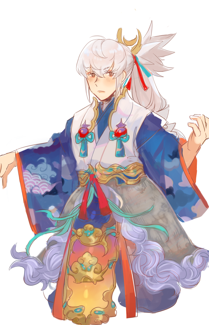 1boy afk_(konnosukeluv) alternate_costume aristocratic_clothes commentary english_commentary fire_emblem fire_emblem_fates grey_hair japanese_clothes long_hair male_focus nintendo orange_eyes ponytail solo takumi_(fire_emblem)