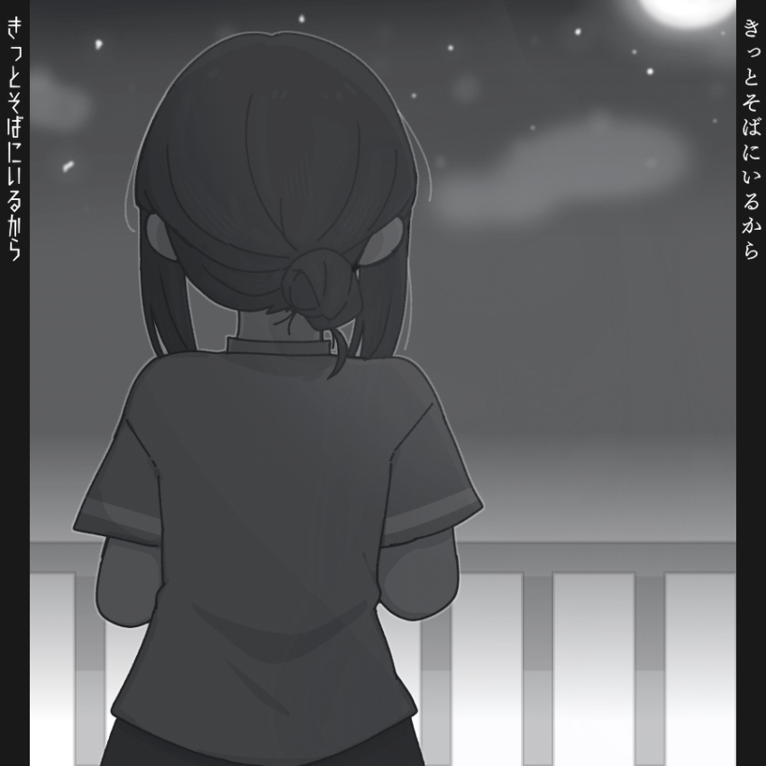 2girls alpha_transparency cho_kaguya-hime! commentary facing_away flower_knot from_behind full_moon greyscale hair_bun hair_ornament hair_rings hair_stick halterneck kurotoia monochrome moon multiple_girls night runami_yachiyo sakayori_iroha shirt short_hair short_sleeves sidelocks single_hair_bun sky star_(sky) starry_sky thumbnail_surprise translation_request twintails upper_body
