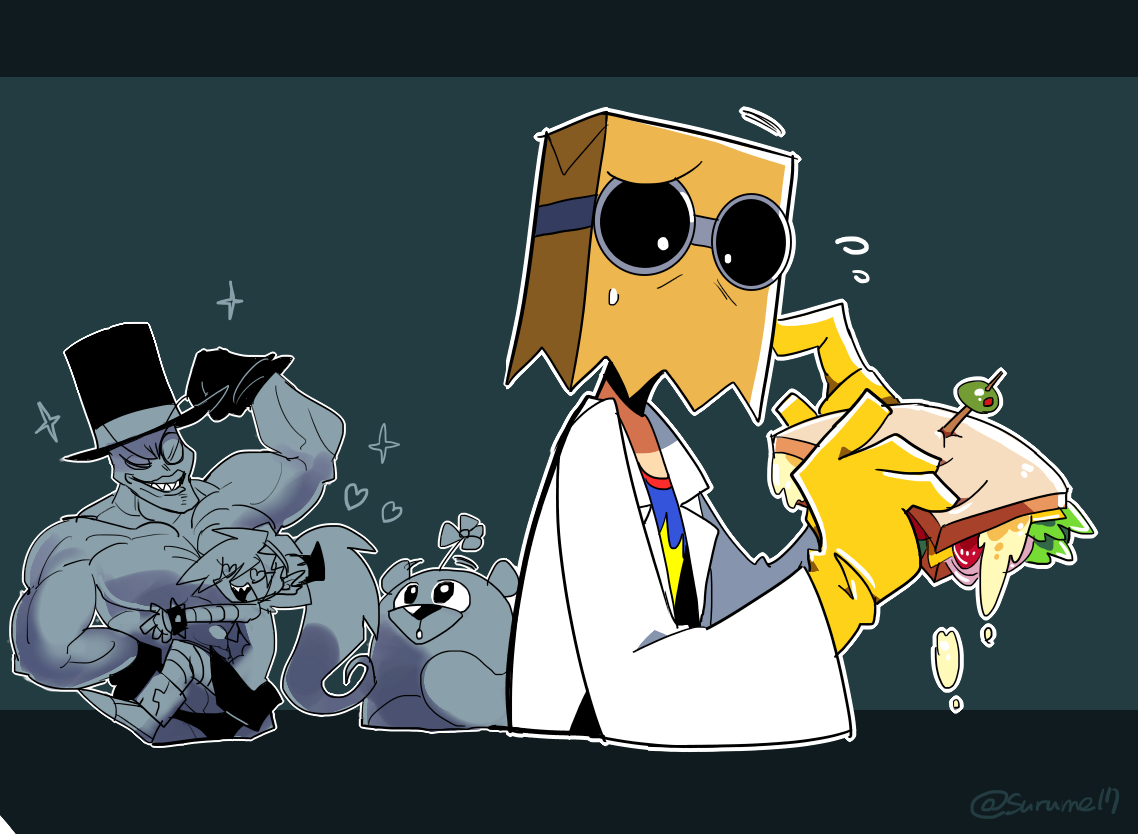 1girl 3boys 5.0.5. bag_on_head commentary_request demencia dr._flug food gloves goggles hat heart heart-shaped_eyes holding holding_food holding_sandwich lab_coat long_hair multiple_boys muscular muscular_male open_mouth pectorals ponytail sandwich sharp_teeth smile sparkle surume17 teeth top_hat upper_body villainous yellow_gloves